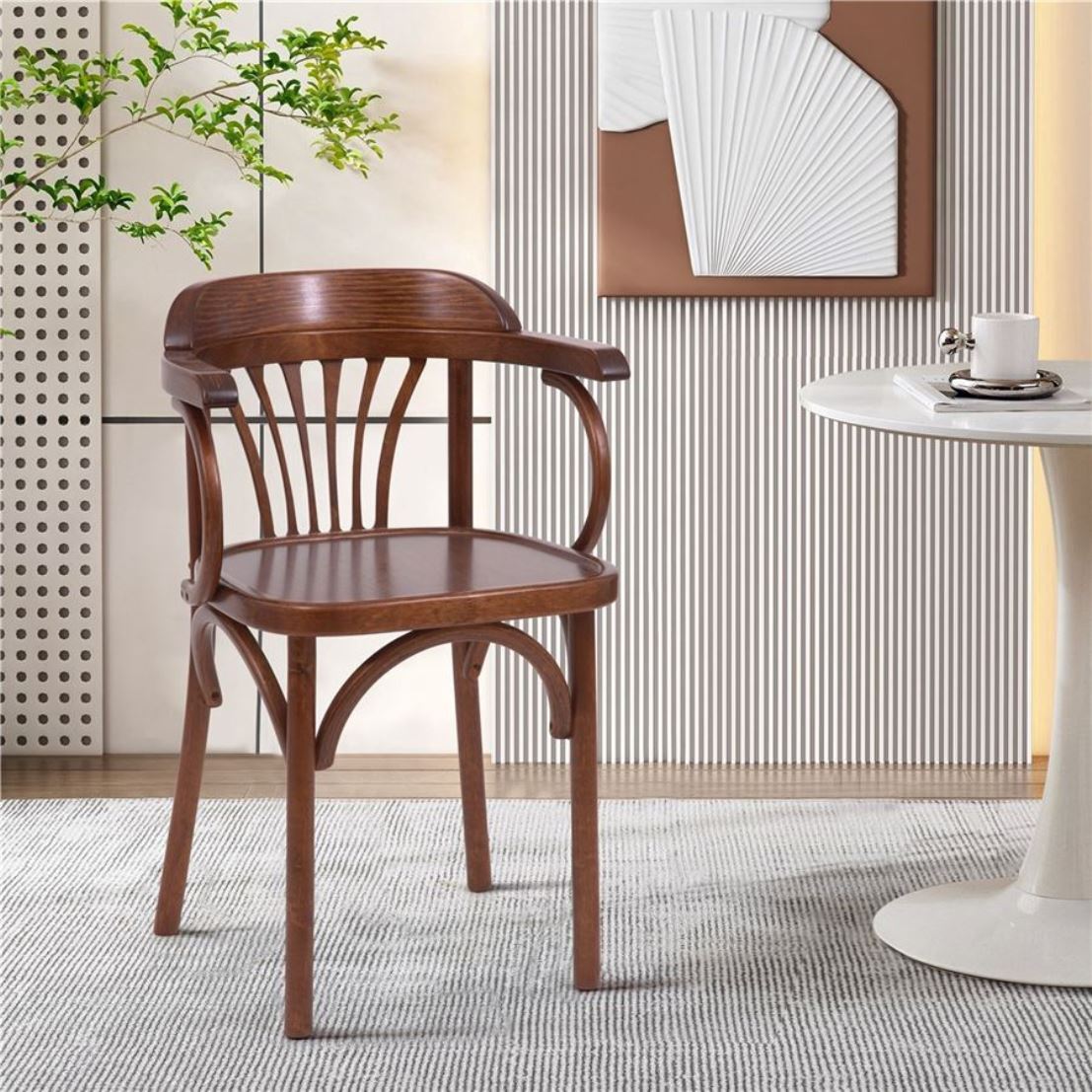 Модель идеально подходит для кухни, столовой, кафе, ресторана или гостиной. Эргономичная спинка с изогнутыми ламелями поддерживает спину, а удобные подлокотники повышают комфорт при длительном сидении.