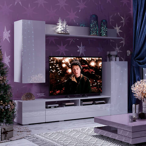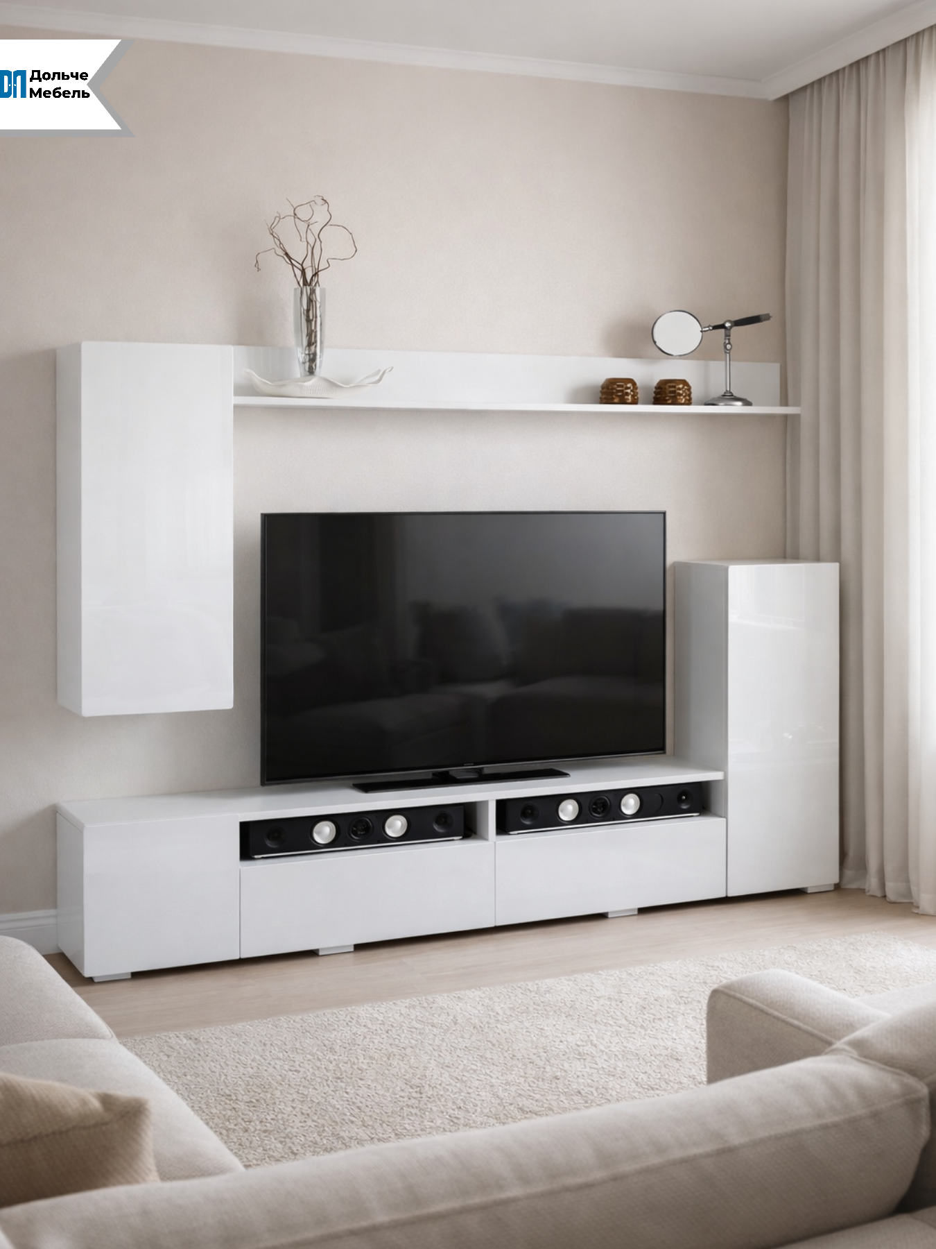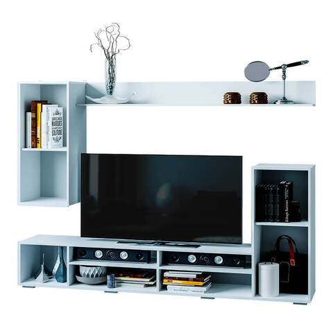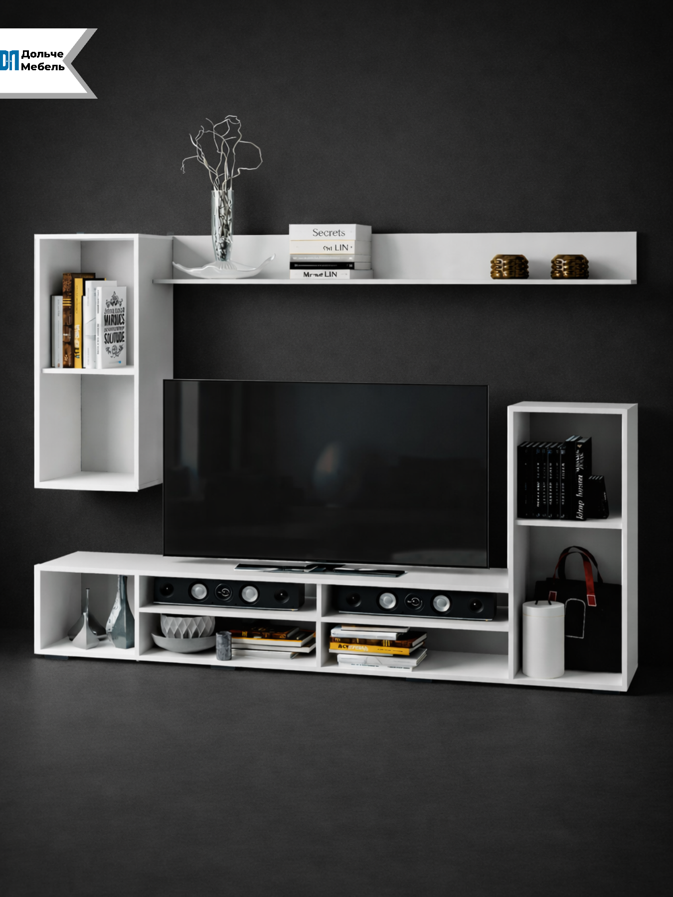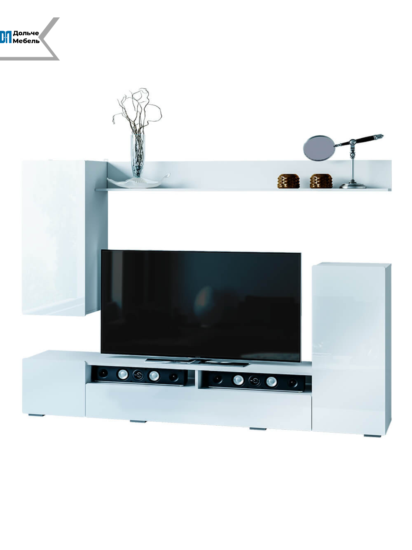 Стенка подходит для размещения телевизора большого формата, аудиосистемы, приставок и декора. Продуманная компоновка позволяет рационально использовать пространство даже в квартирах с ограниченной площадью.