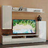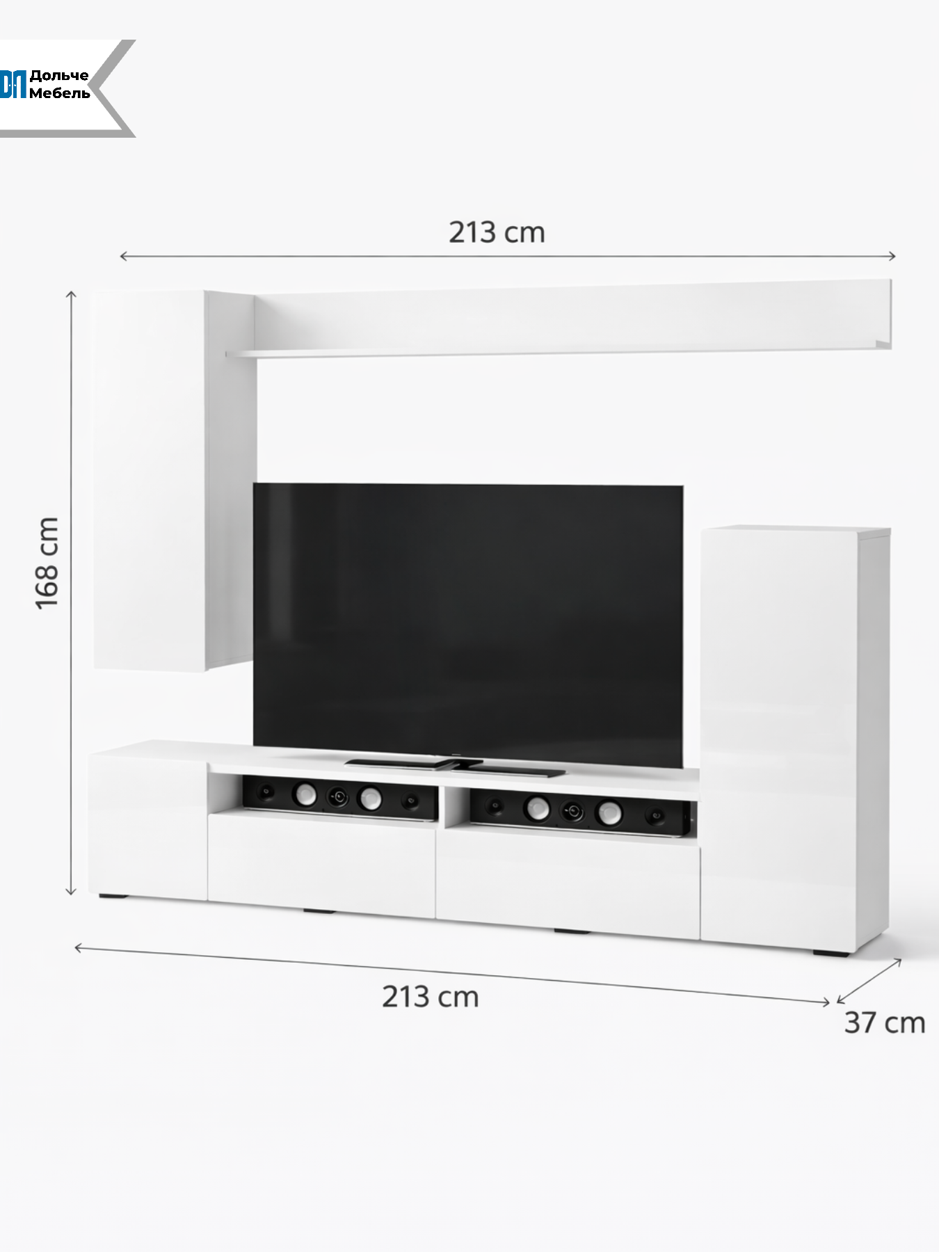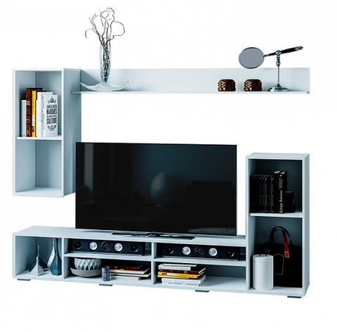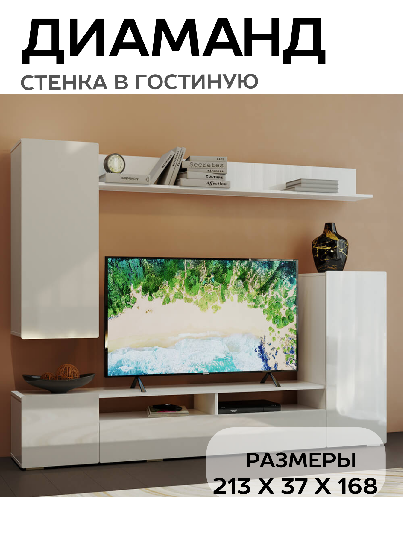 Стенка БТС Мебель Диаманд — современное и функциональное решение для оформления гостиной. Комплект шириной 213 см сочетает ТВ-тумбу, навесные шкафы и открытые ниши, обеспечивая удобное хранение и аккуратную организацию медиазоны.