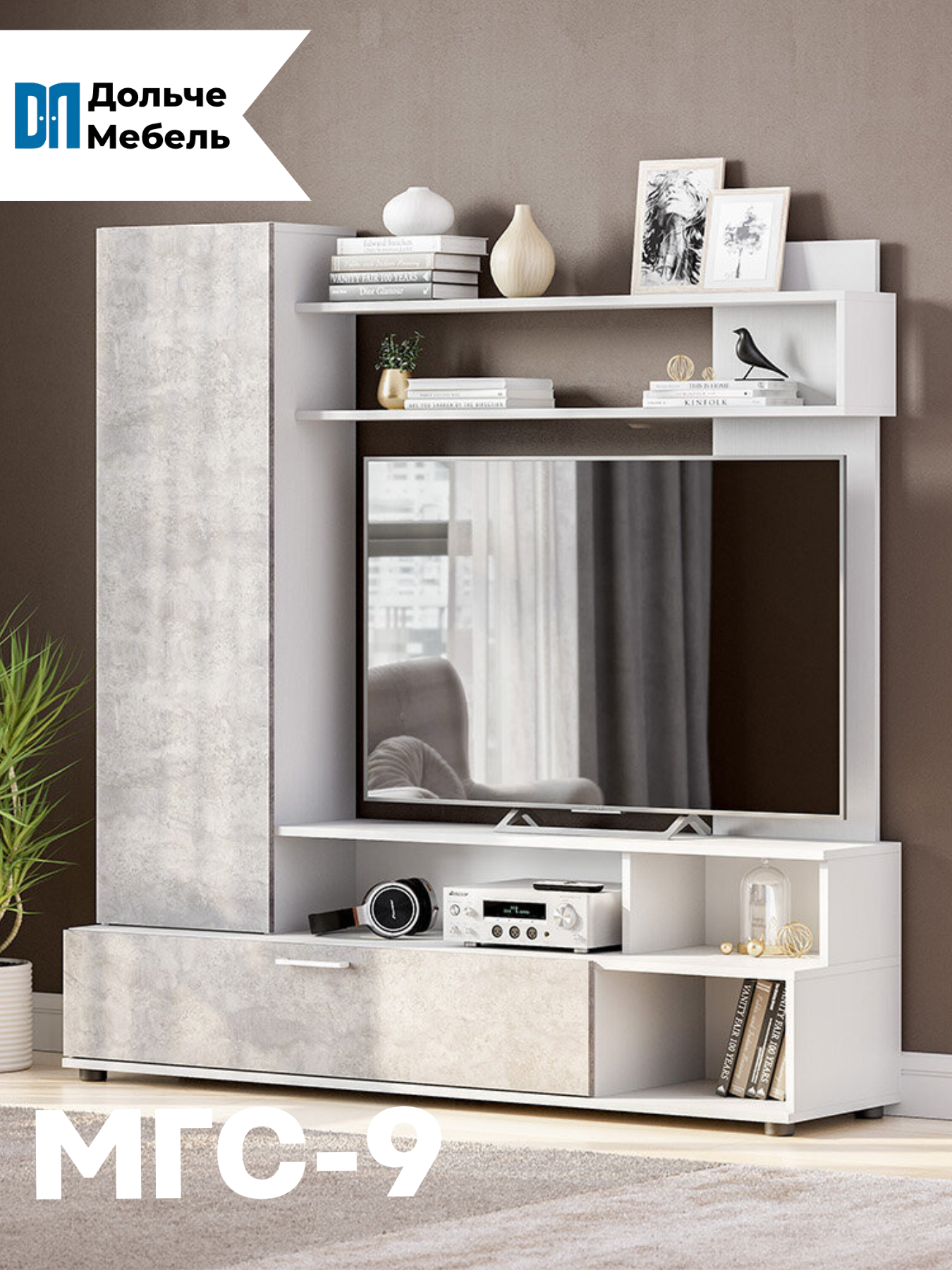 Современный дизайн стенки в гостиную под телевизор SV Мебель МГС 9 подчеркнет ваш вкус и станет ярким акцентом в интерьере. Белый и серый цвета в сочетании с цементным светлым оттенком создают гармоничное и стильное сочетание.