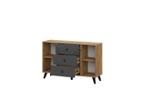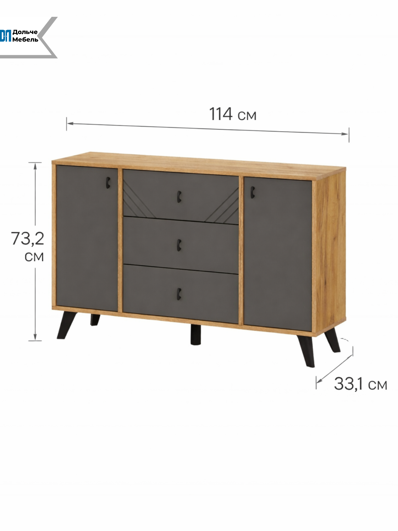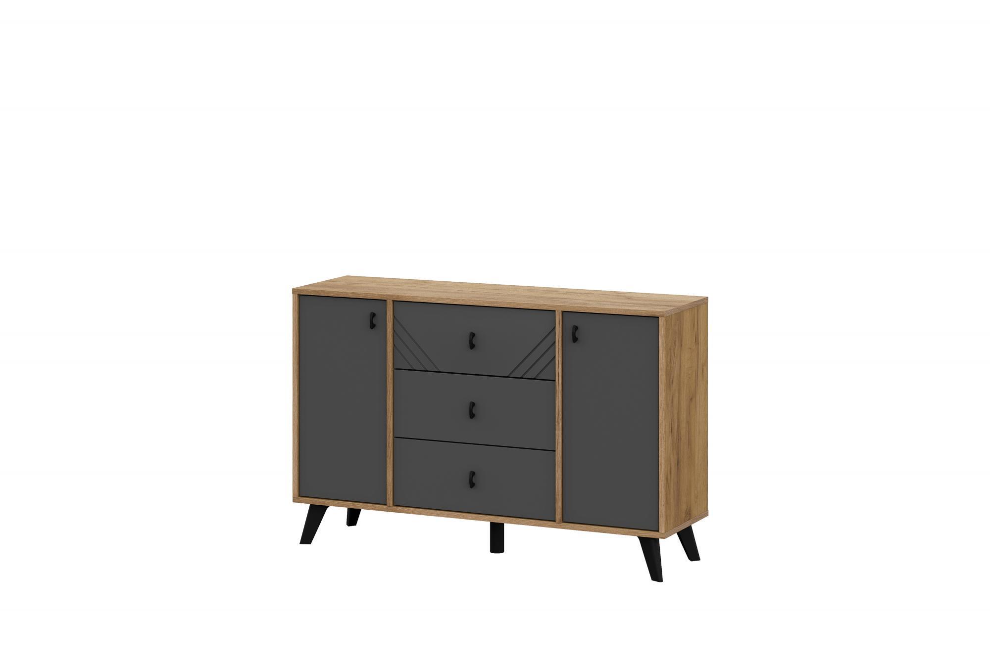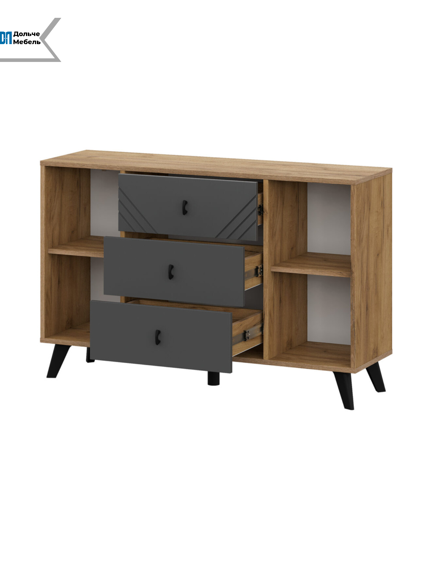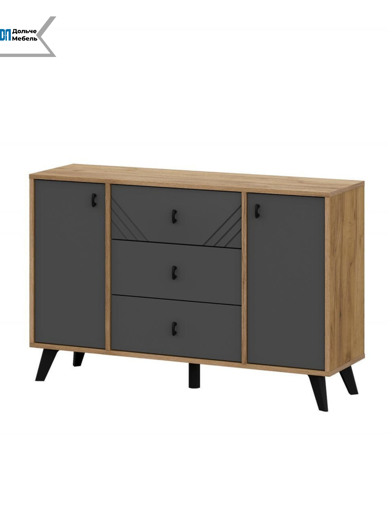 Комод выполнен в современном сочетании цветов Дуб Золотой / Графит, которое подчёркивает геометрию фасадов и легко вписывается в интерьеры в стилях лофт, скандинавский, современный и минимализм. Чёрные ножки придают конструкции визуальную лёгкость и упрощают уборку под мебелью.