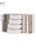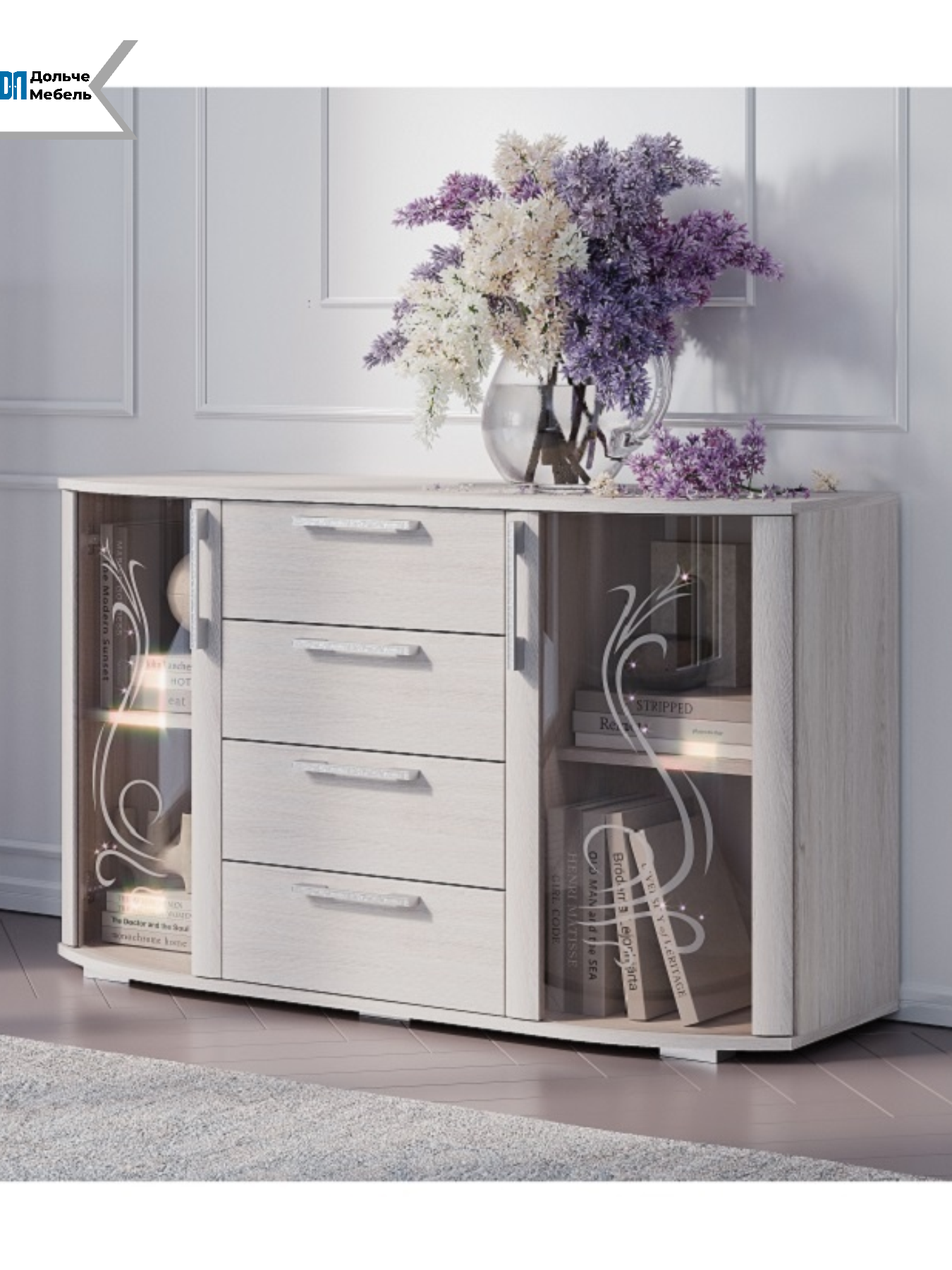 Комод оснащен четырьмя ящиками с роликовыми направляющими, обеспечивающими плавное и бесшумное открывание и закрывание. Накладные петли и оригинальная лицевая фурнитура белого цвета добавляют изделию изысканности.