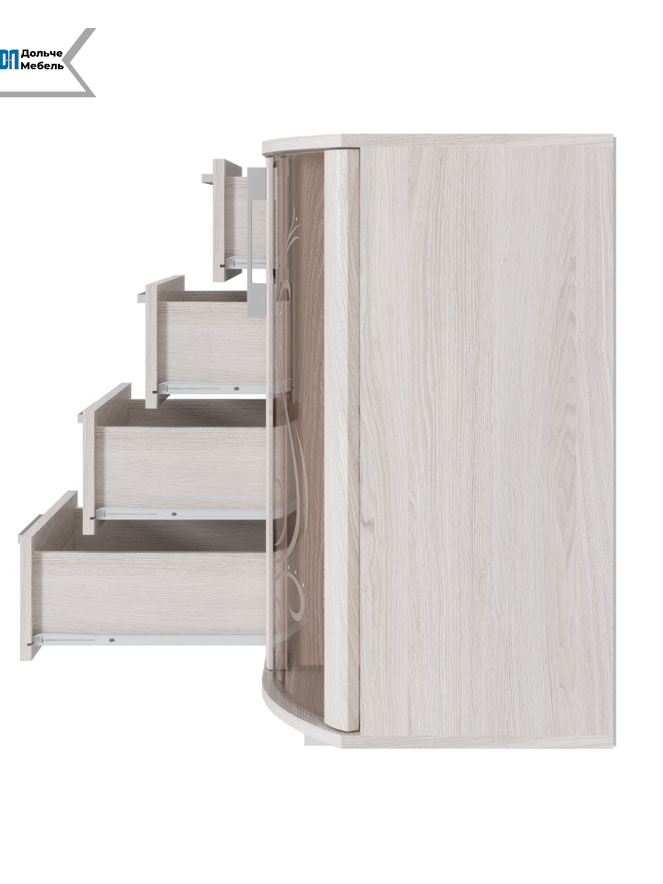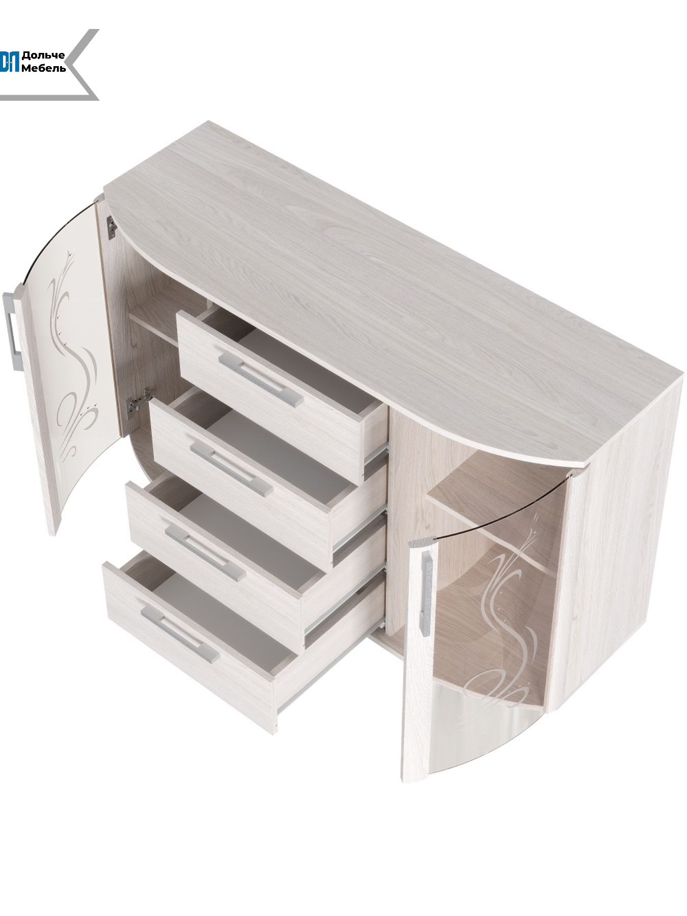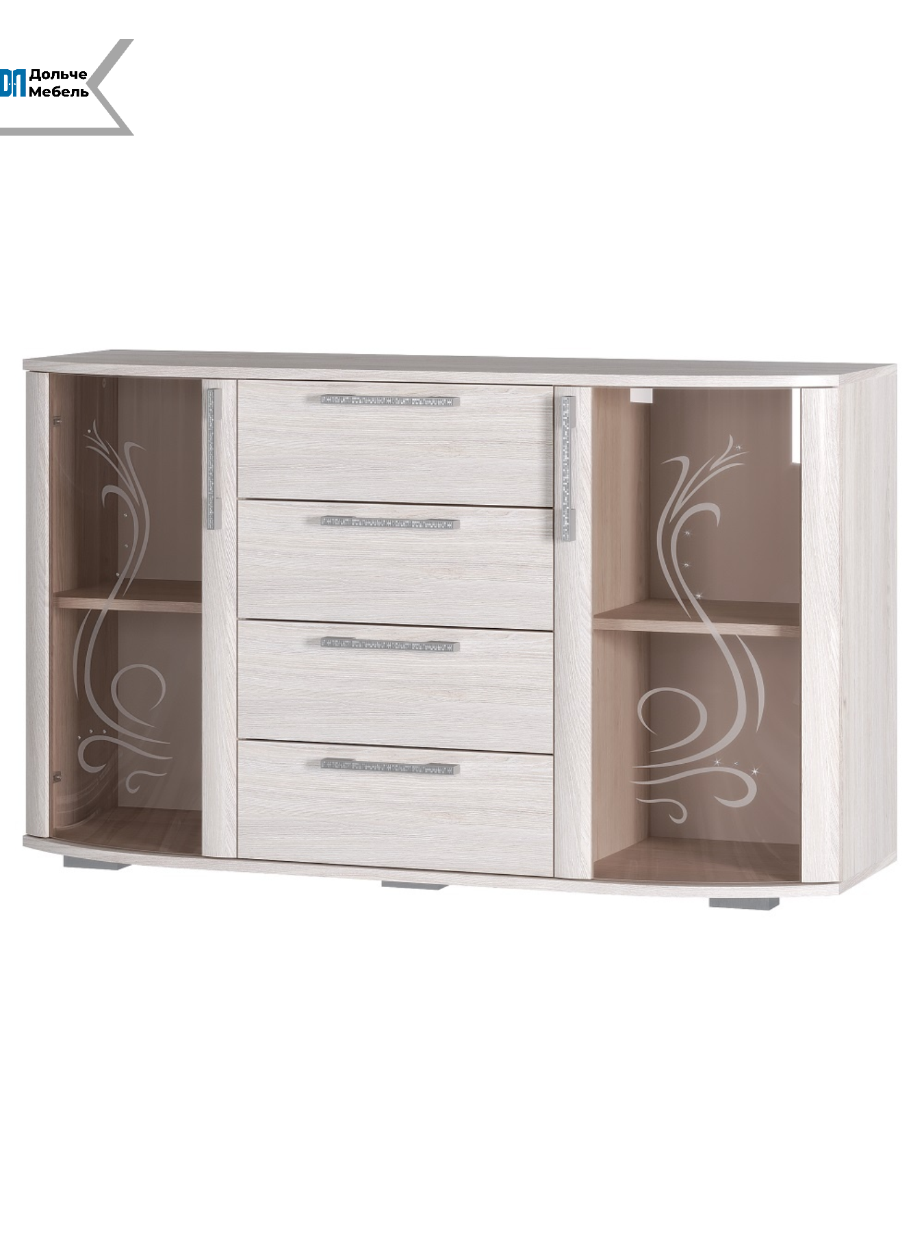 Комод выполнен в декоре "ясень", который украшен изящными узорами и стразами Swarovski на гнутых стеклостворках. Это делает его не только практичным, но и эстетически привлекательным элементом интерьера.