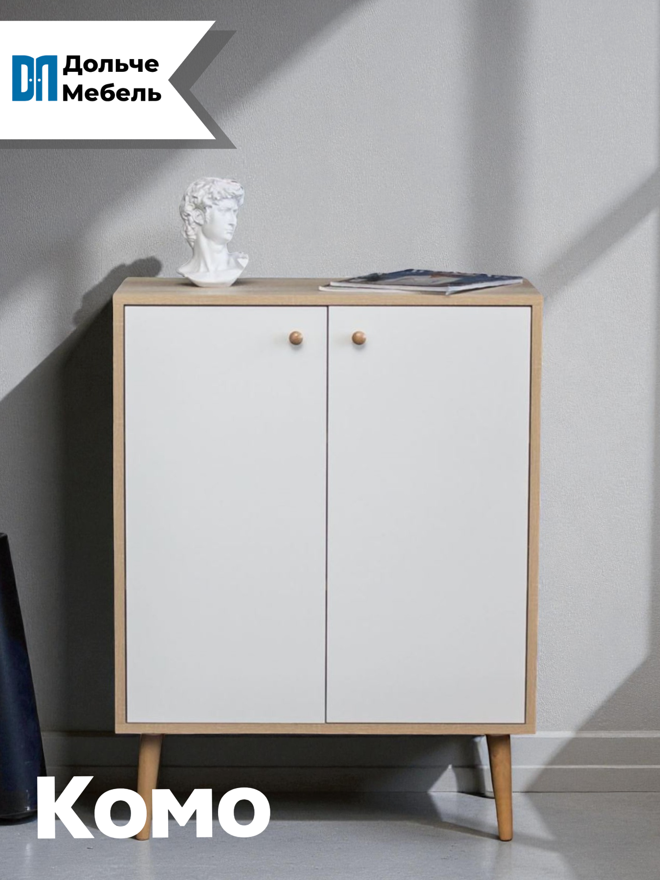 Комод Komo-3 выполнен в современном стиле, сочетая в себе белый цвет и оттенок дуба сонома. Корпус и фасад изготовлены из качественного ЛДСП, что обеспечивает долговечность и надежность изделия.