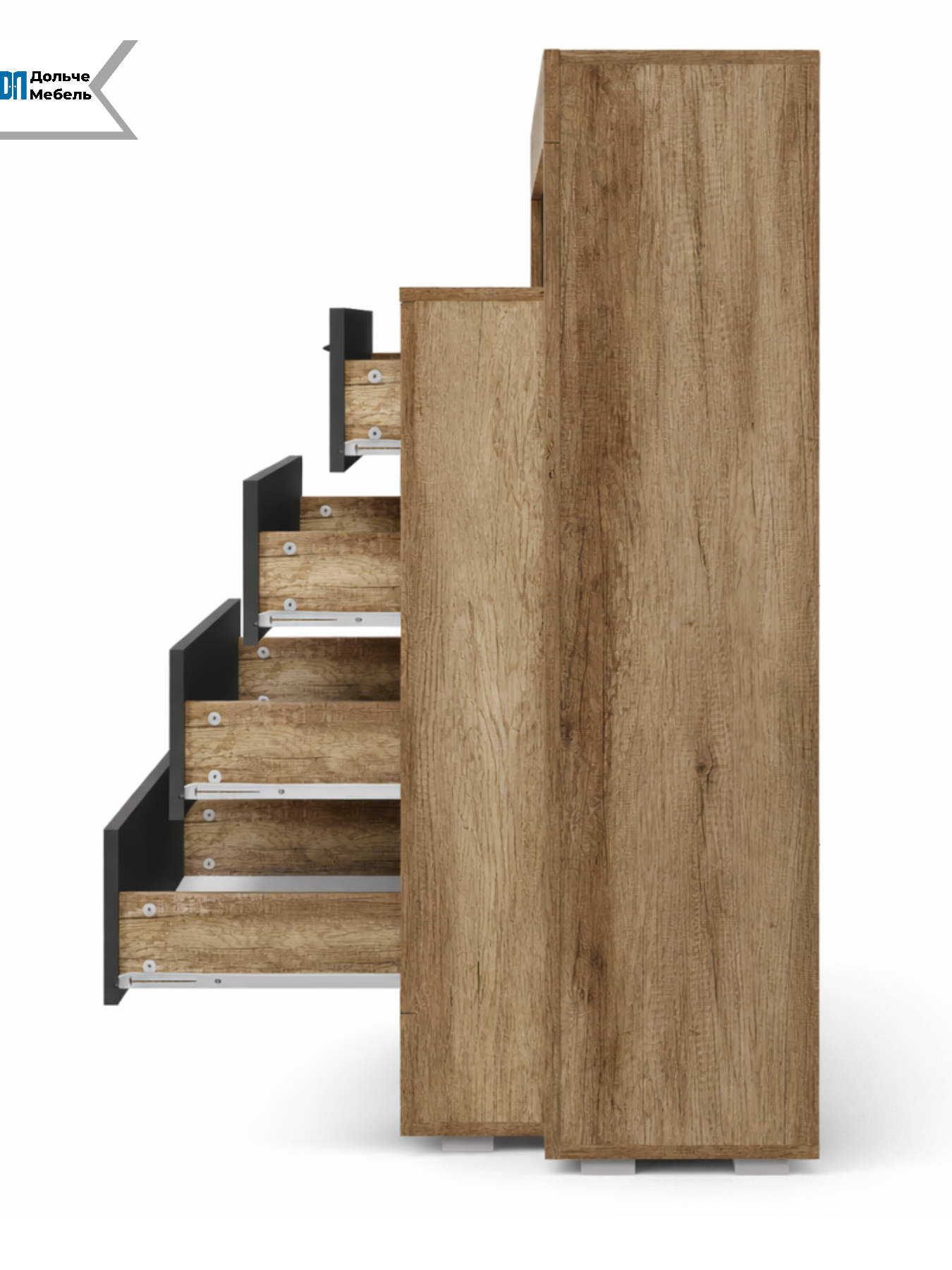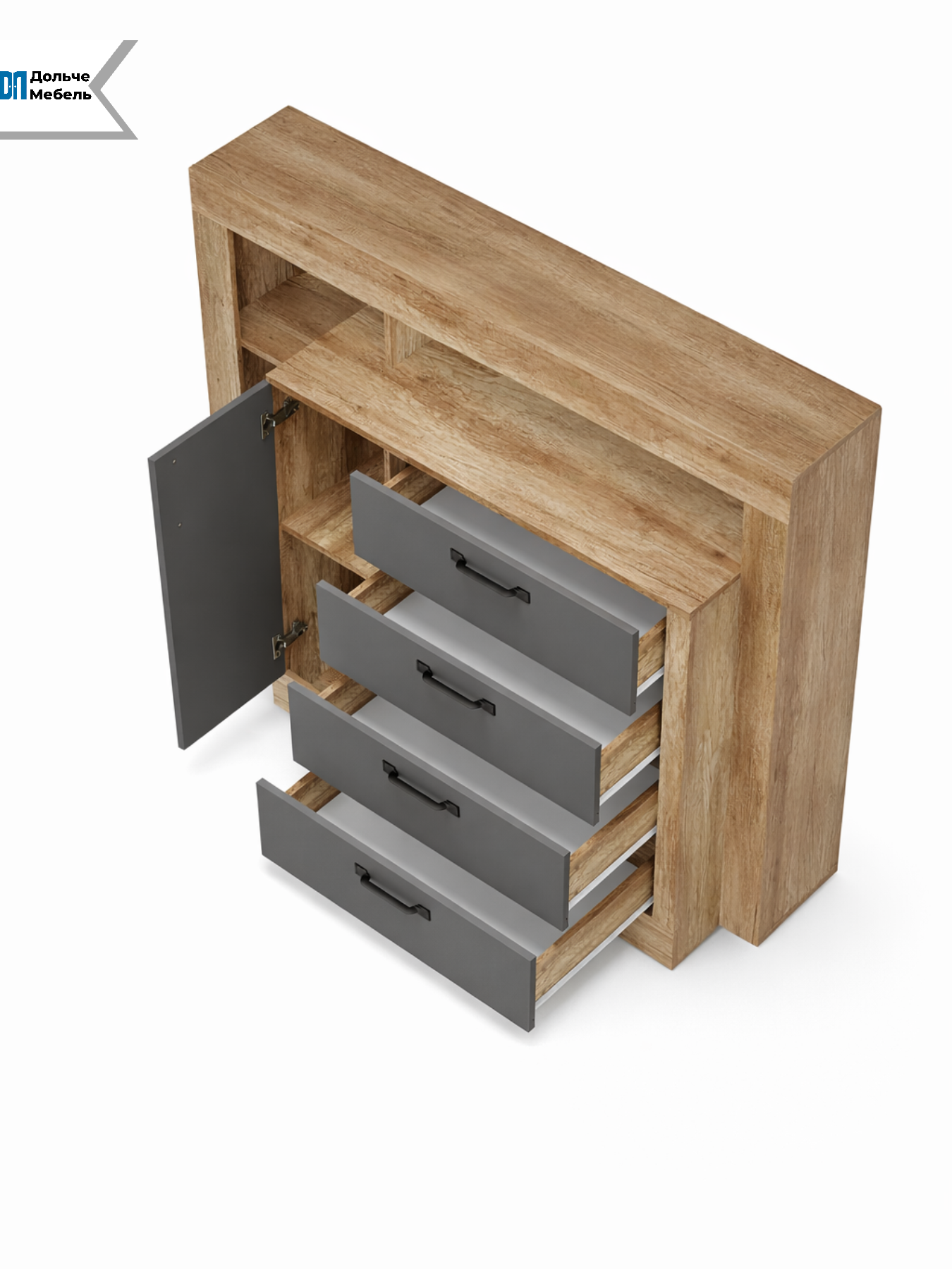 Комод Прима КМ-17 - это функциональная мебель для хранения одежды, белья и повседневных вещей. Он сочетает в себе выдвижные ящики, закрытую секцию с дверцей и открытые полки, что позволяет удобно распределить содержимое и быстро находить нужные предметы. Верхняя поверхность подходит для размещения декора, техники или аксессуаров.