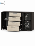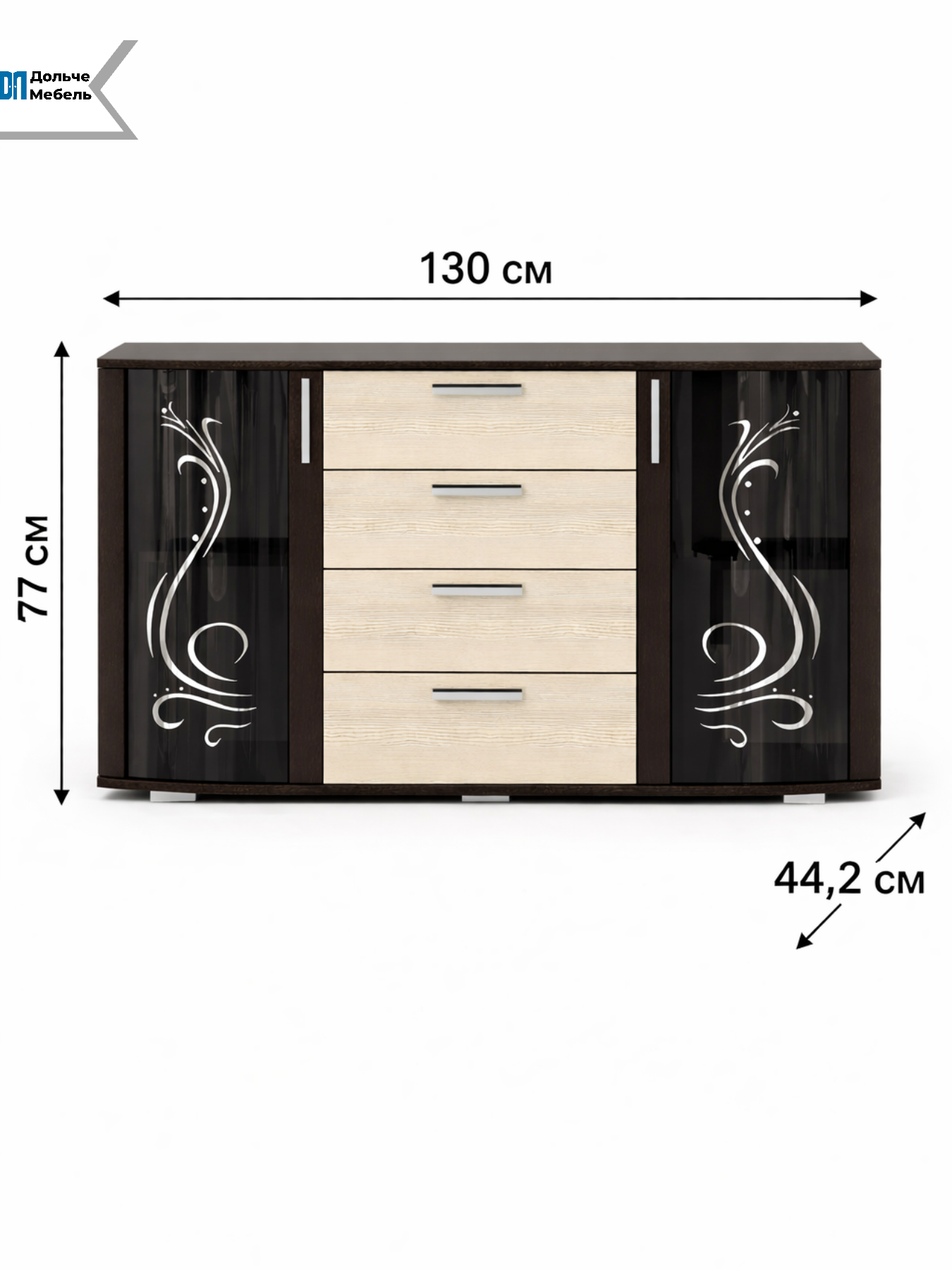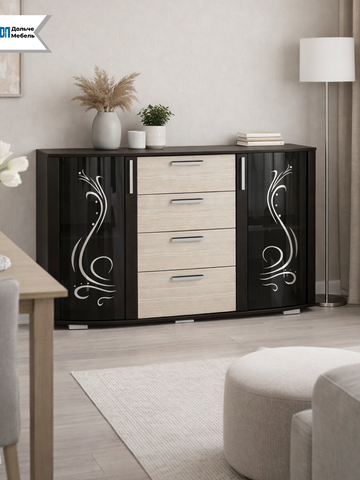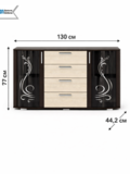 Благодаря увеличенной ширине 130 см комод отлично подходит для спальни, гостиной или столовой, заменяя сразу несколько предметов мебели. Декоративные стеклянные фасады с рисунком придают модели элегантный внешний вид и подчёркивают интерьер.