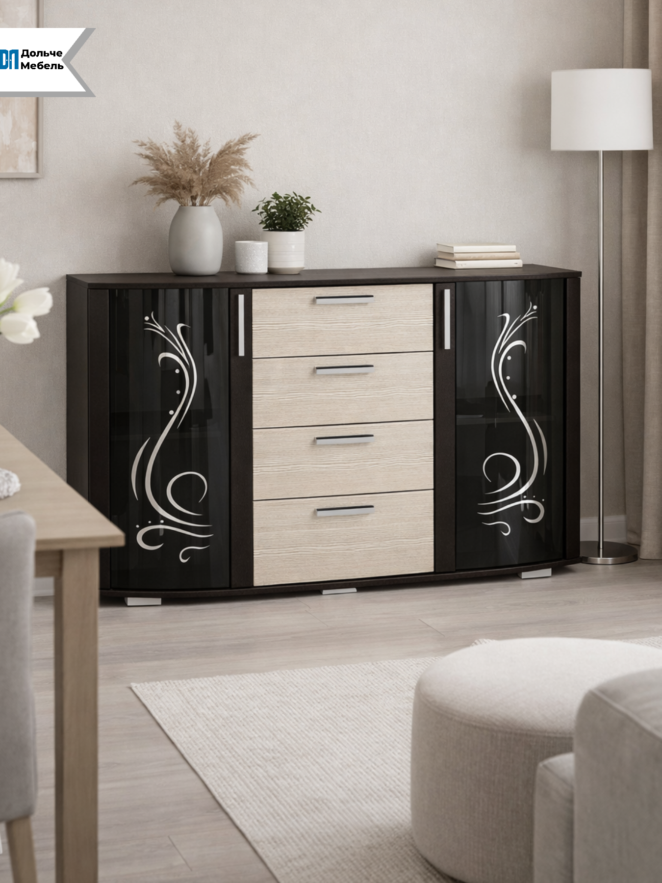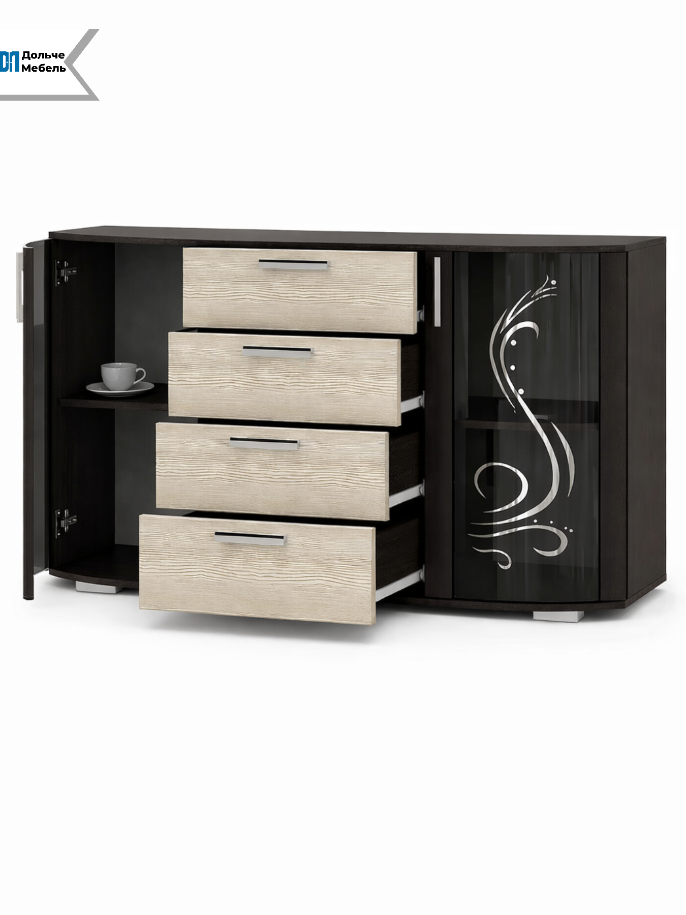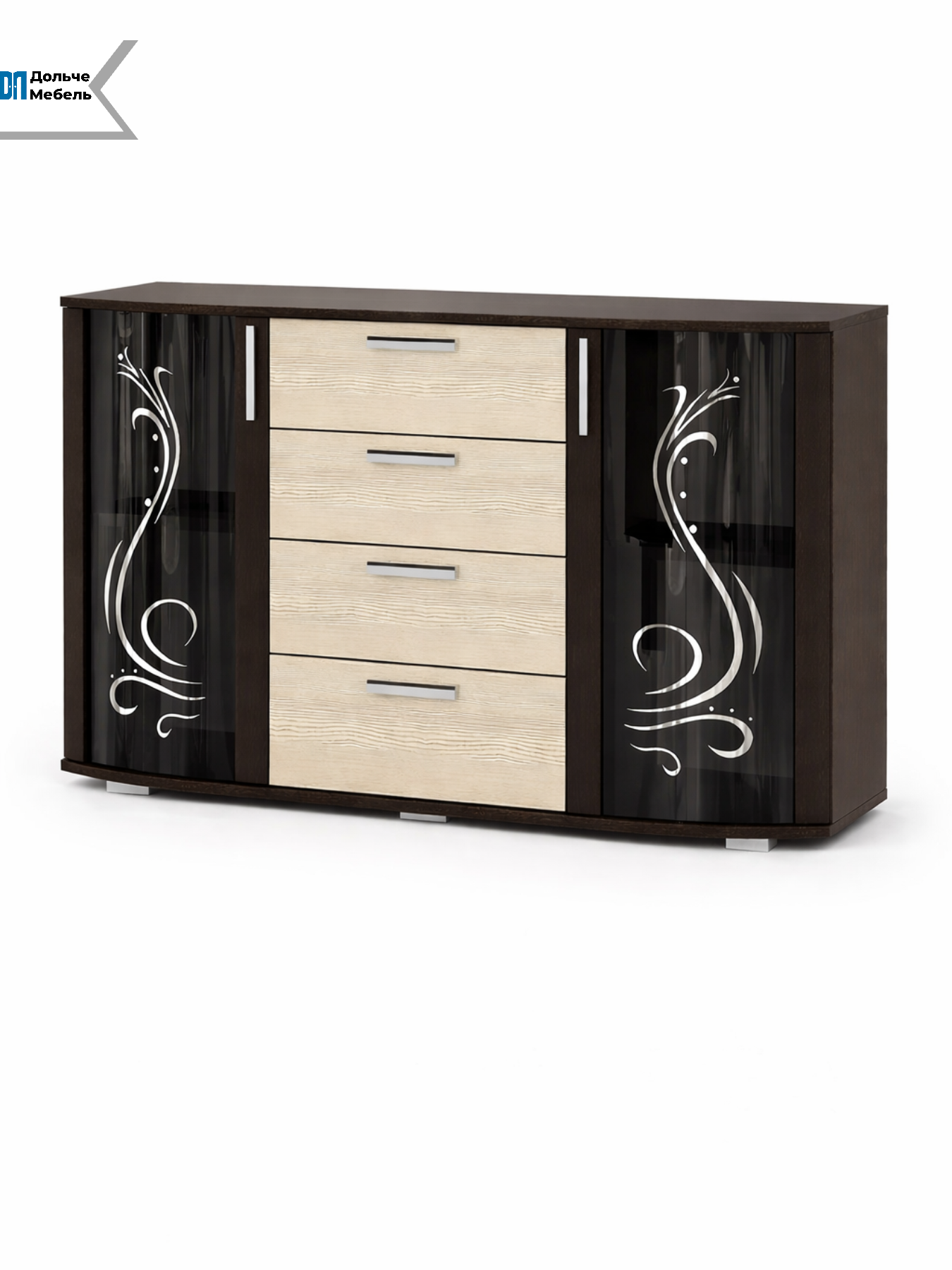 Комод БТС Мебель Грация — вместительное и стильное решение для хранения одежды, белья и домашних вещей. Модель сочетает в себе 4 выдвижных ящика и 2 шкафа со стеклянными дверцами, что делает хранение максимально удобным и организованным.