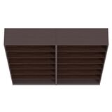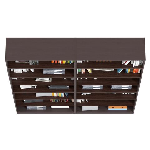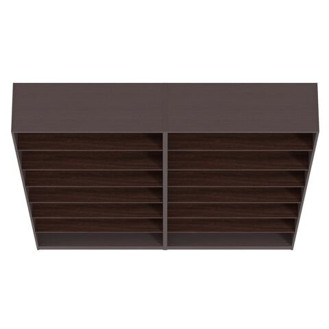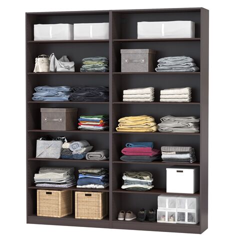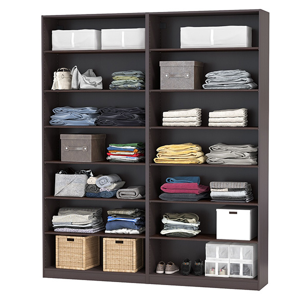 Особенностью данного стеллажа является его открытая конструкция, состоящая из двух блоков по 100 см и вмещающая 12 полок. Это позволяет легко организовать пространство и обеспечивает быстрый доступ к вещам.