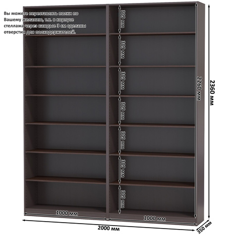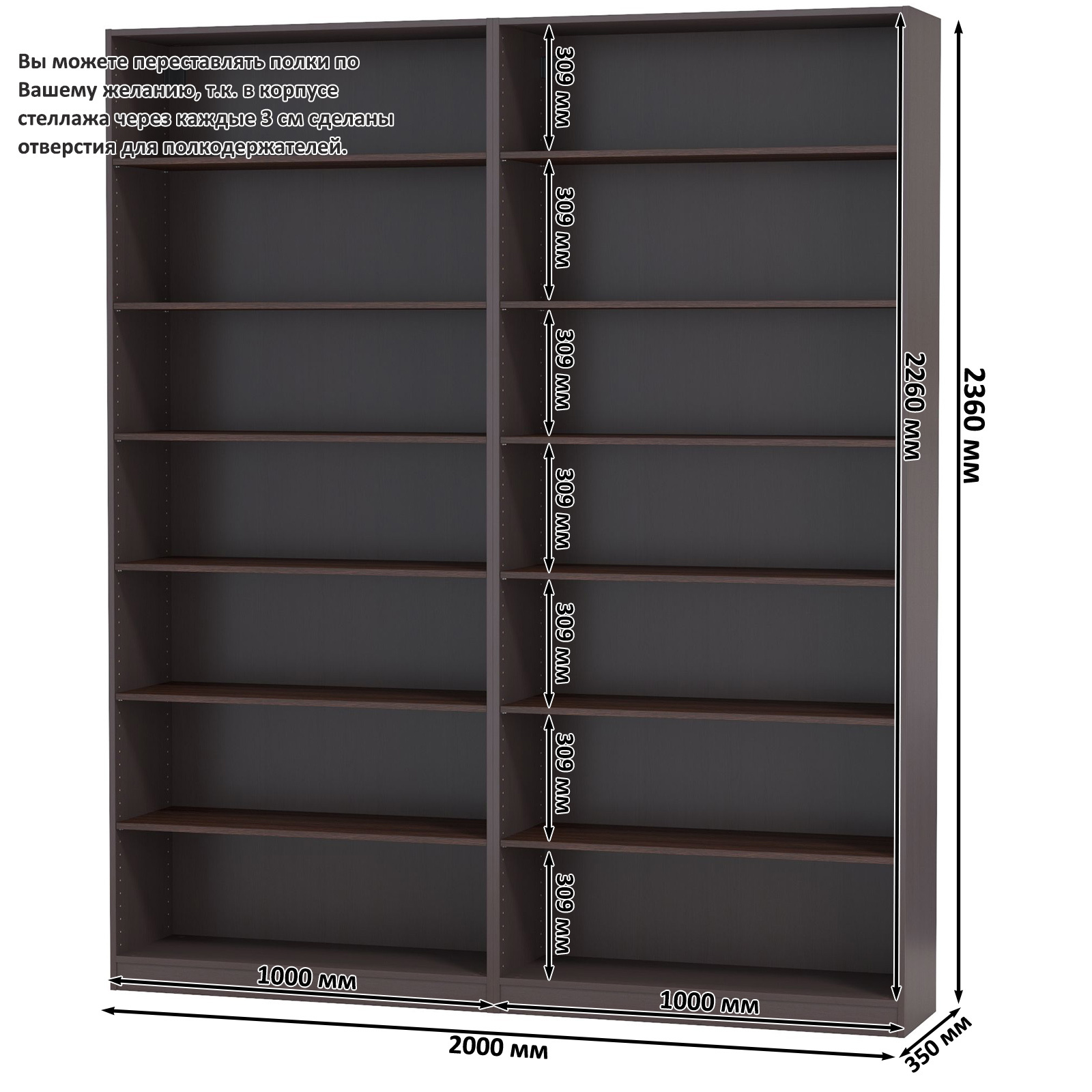 Цвет стеллажа – чёрно-коричневый/венге, что придает ему элегантный и современный вид. Габариты стеллажа составляют 200х35х236 см, что делает его вместительным и удобным для размещения различных предметов.