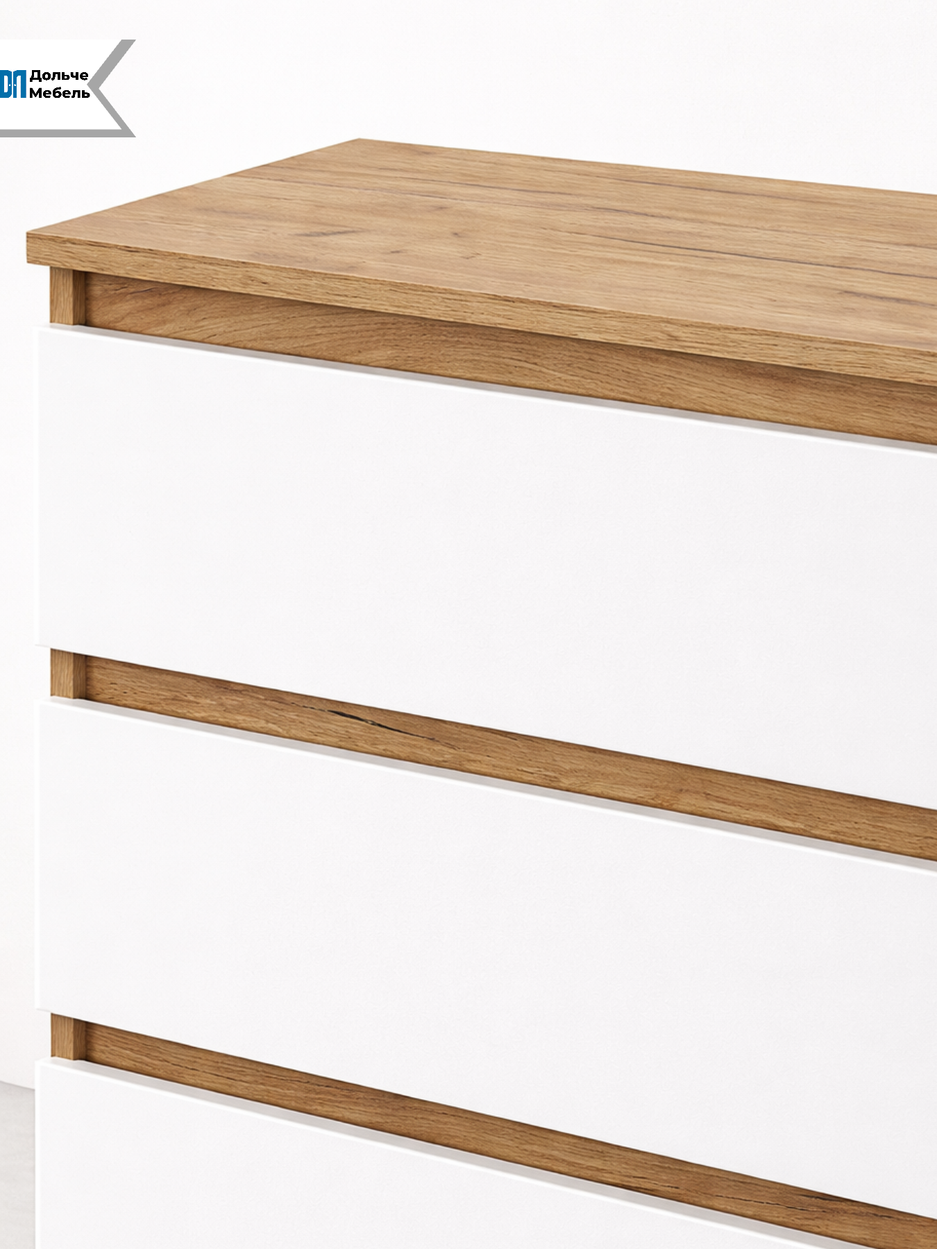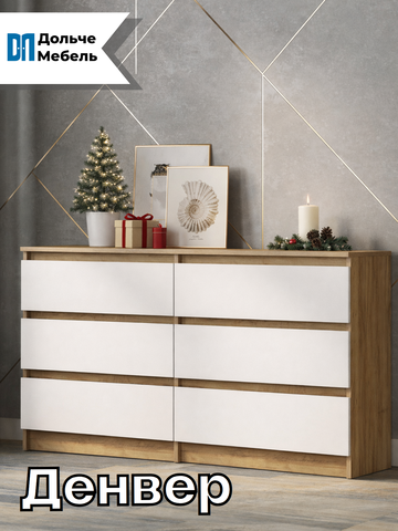 Комод с ящиками из модульной серии Денвер станет отличным дополнением к современному и сканди интерьеру. Цвет дуб золотой и белый придают комоду изысканный и стильный вид.