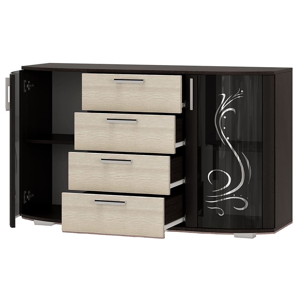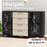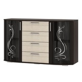 Благодаря увеличенной ширине 130 см комод отлично подходит для спальни, гостиной или столовой, заменяя сразу несколько предметов мебели. Декоративные стеклянные фасады с рисунком придают модели элегантный внешний вид и подчёркивают интерьер.