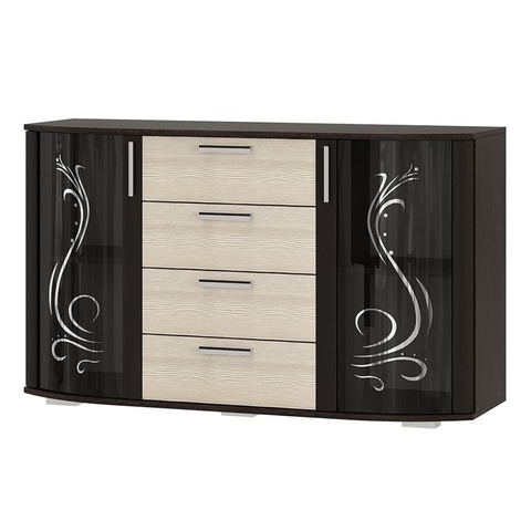 Комод БТС Мебель Грация — вместительное и стильное решение для хранения одежды, белья и домашних вещей. Модель сочетает в себе 4 выдвижных ящика и 2 шкафа со стеклянными дверцами, что делает хранение максимально удобным и организованным.