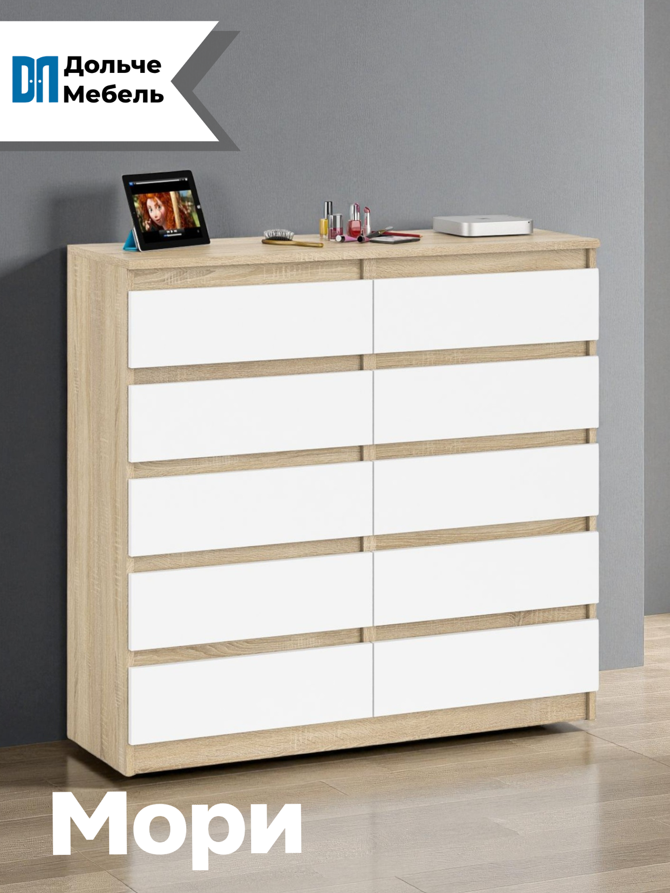 Особенностью данного комода является его дизайн. Цвет "дуб сонома/белый" позволяет гармонично вписаться в любой интерьер, а продуманная конструкция с десятью выдвижными ящиками, расположенными по пять в два ряда, позволяет убрать лишние предметы, сохраняя единый стиль оформления помещения.