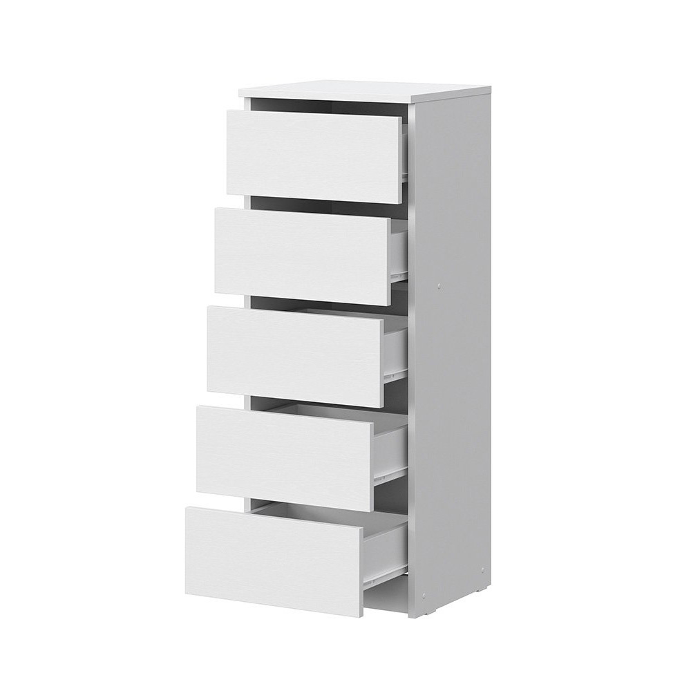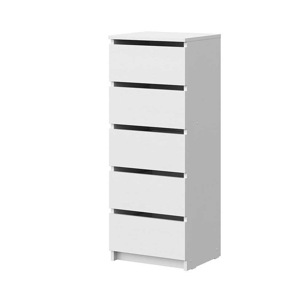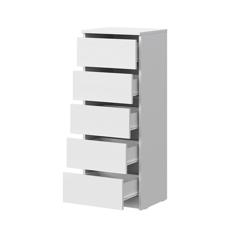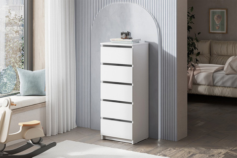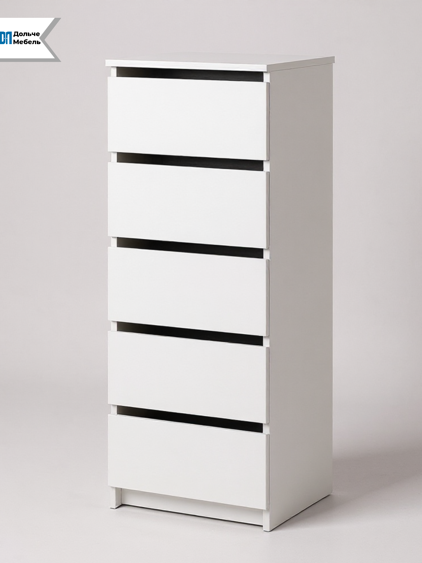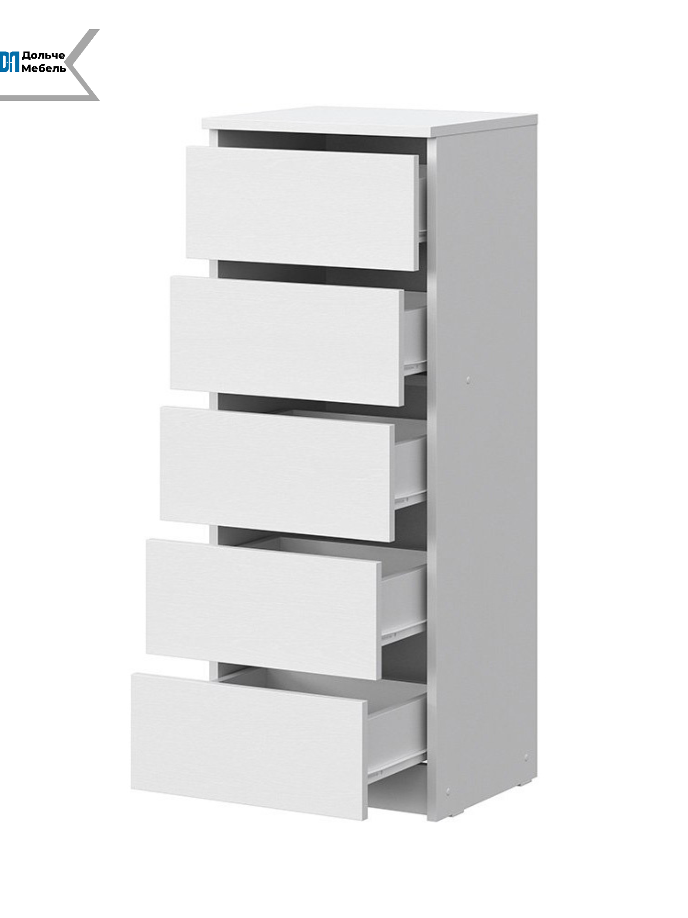 Комод оснащен пятью вместительными ящиками, которые позволят организовать место хранения белья, одежды, аксессуаров и других нужных предметов. Роликовые направляющие обеспечивают плавное и бесшумное выдвижение ящиков.