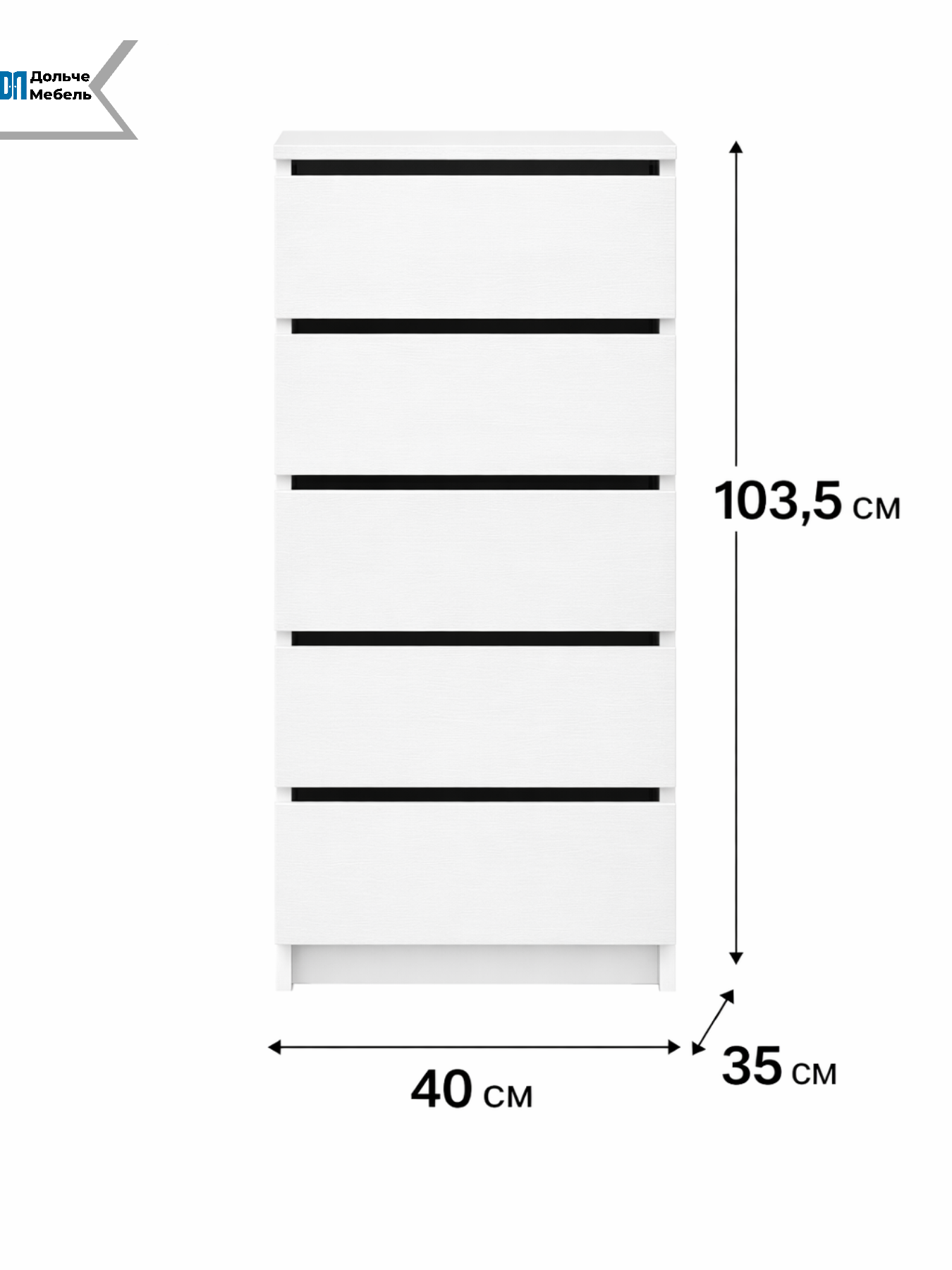 Комод имеет следующие размеры: высота – 103,5 см, ширина – 40,0 см, глубина – 35,0 см. Материалы корпуса и фасада – ЛДСП, что гарантирует прочность и долговечность изделия.
