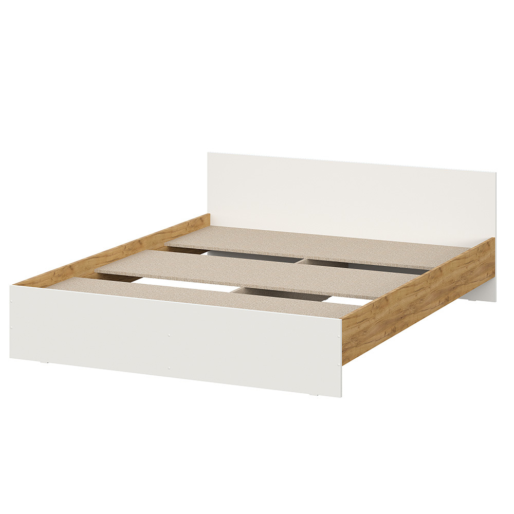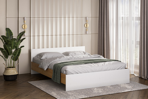 Каркас выполнен в стильном сочетании цветов дуб золотой и белый шагрень, что делает модель универсальной для светлых и современных интерьеров. Высокое изголовье визуально завершает композицию спальни и удобно для отдыха в положении сидя.