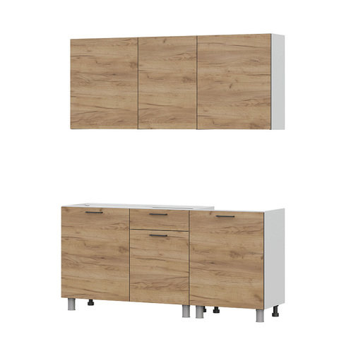Гарнитур выполнен в цвете дуб золотой, который создаёт тёплую атмосферу и гармонично сочетается с различными стилями кухни, включая современный, скандинавский и минимализм. Прямая компоновка позволяет удобно разместить кухонную мебель вдоль одной стены, обеспечивая комфортную организацию рабочей зоны.