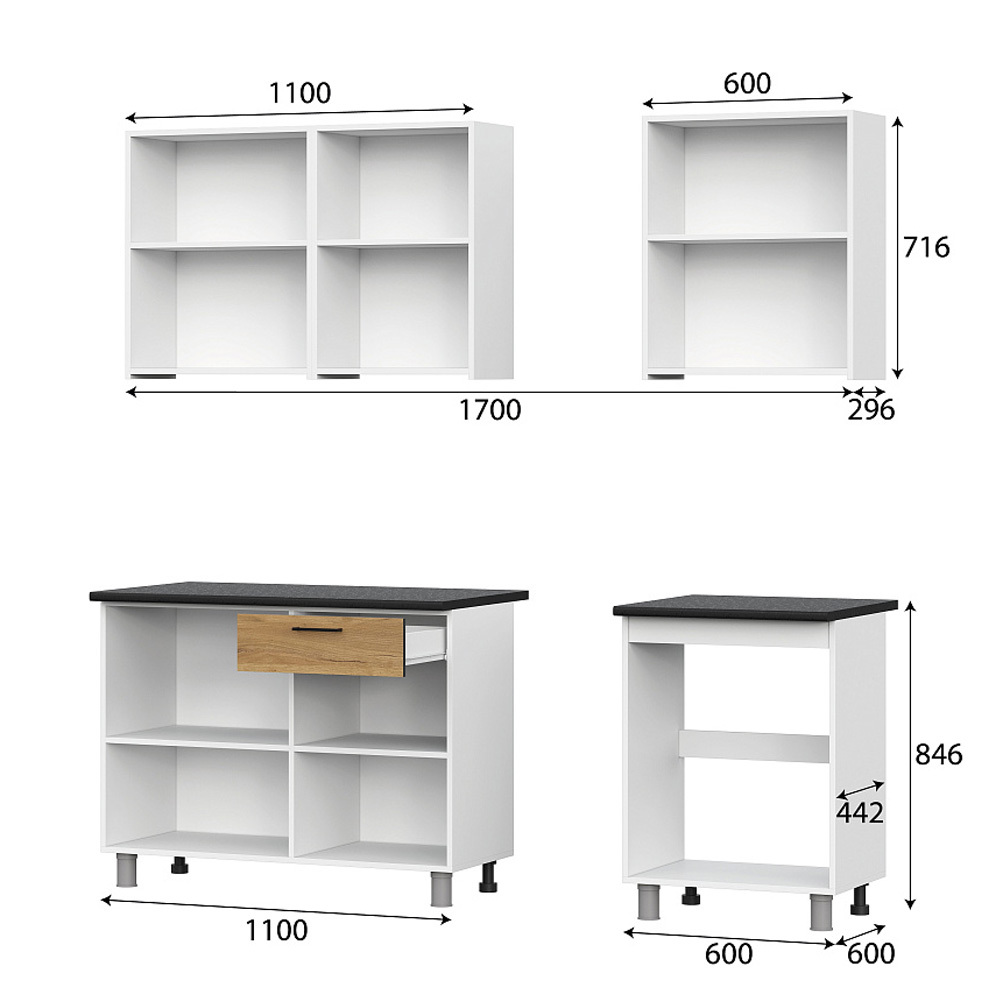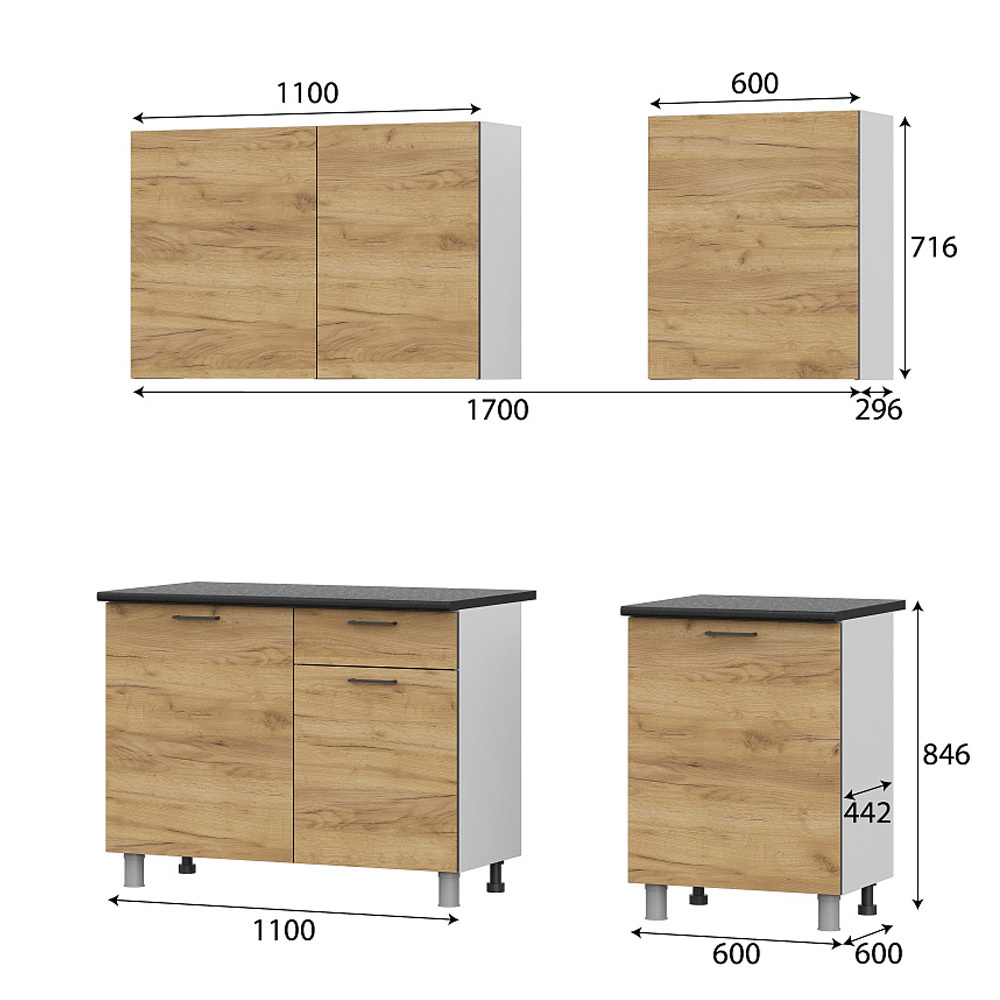 Кухонный гарнитур 170 см подойдёт для использования в качестве готовой прямой кухни, модульной кухни или кухонного гарнитура для небольшой кухни. Модель сочетает практичность, актуальный дизайн и универсальный размер, подходящий для большинства планировок.