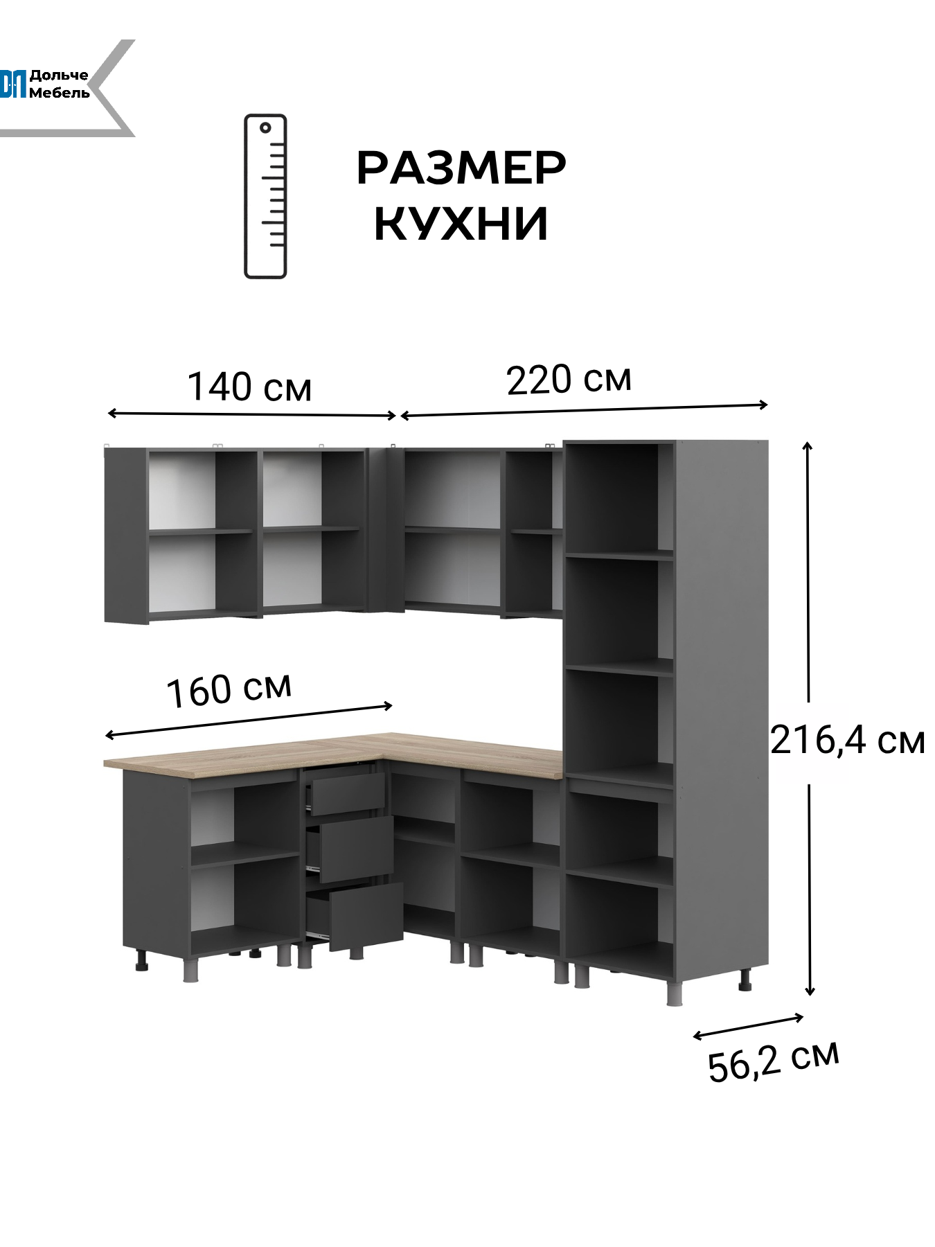 Кухонный гарнитур Денвер 220х160 см поставляется без столешницы, что дает возможность подобрать вариант под индивидуальные требования по цвету и материалу. Угловая кухня с пеналом — это практичное решение для тех, кто ищет вместительный кухонный гарнитур с продуманной организацией хранения и современным дизайном.