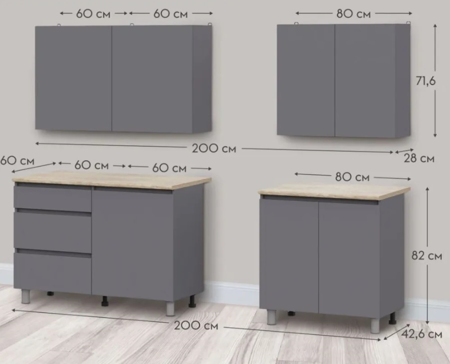 Размеры гарнитура составляют 200 см в ширину, 60 см в глубину и 214 см в высоту. Вес гарнитура составляет 127 кг, что говорит о его надежности и устойчивости.
