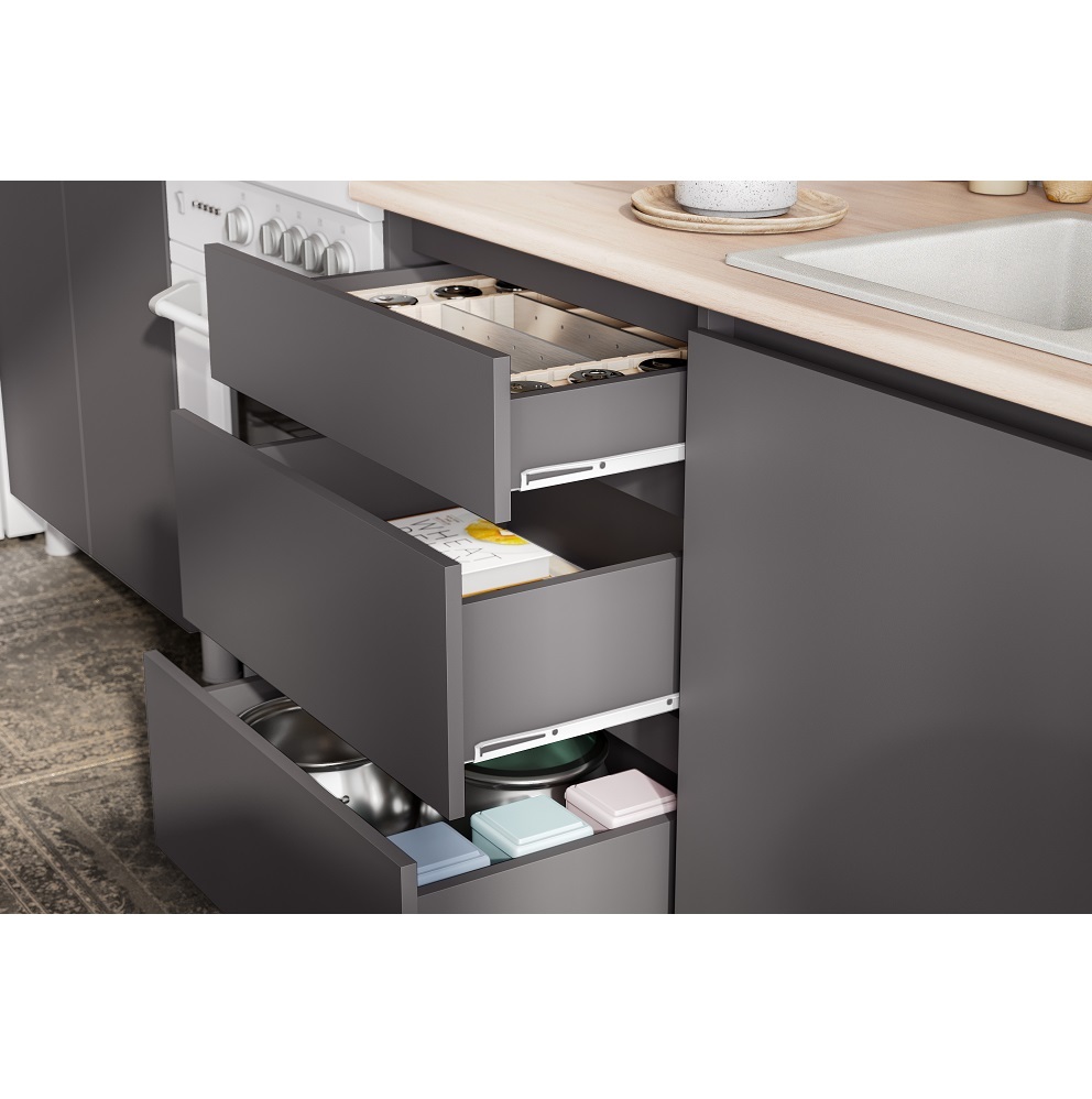 Гарнитур включает в себя различные элементы, такие как настенные шкафы, напольные шкафы с ящиками и полками, а также столешницу. Это позволяет максимально эффективно использовать пространство и организовать хранение различных предметов.