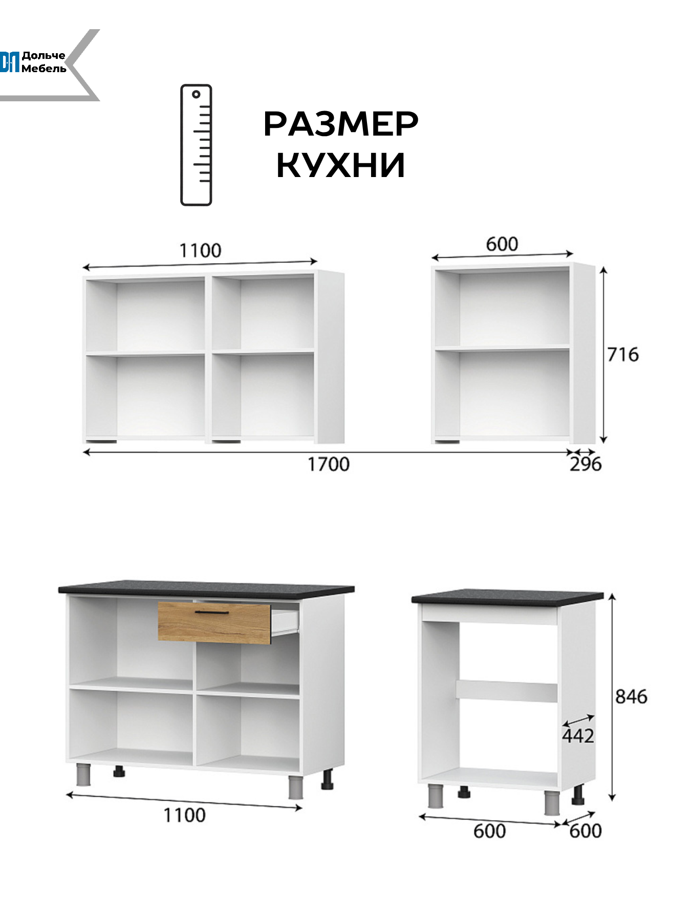 Кухонный гарнитур 170 см подойдёт для использования в качестве готовой прямой кухни, модульной кухни или кухонного гарнитура для небольшой кухни. Модель сочетает практичность, актуальный дизайн и универсальный размер, подходящий для большинства планировок.