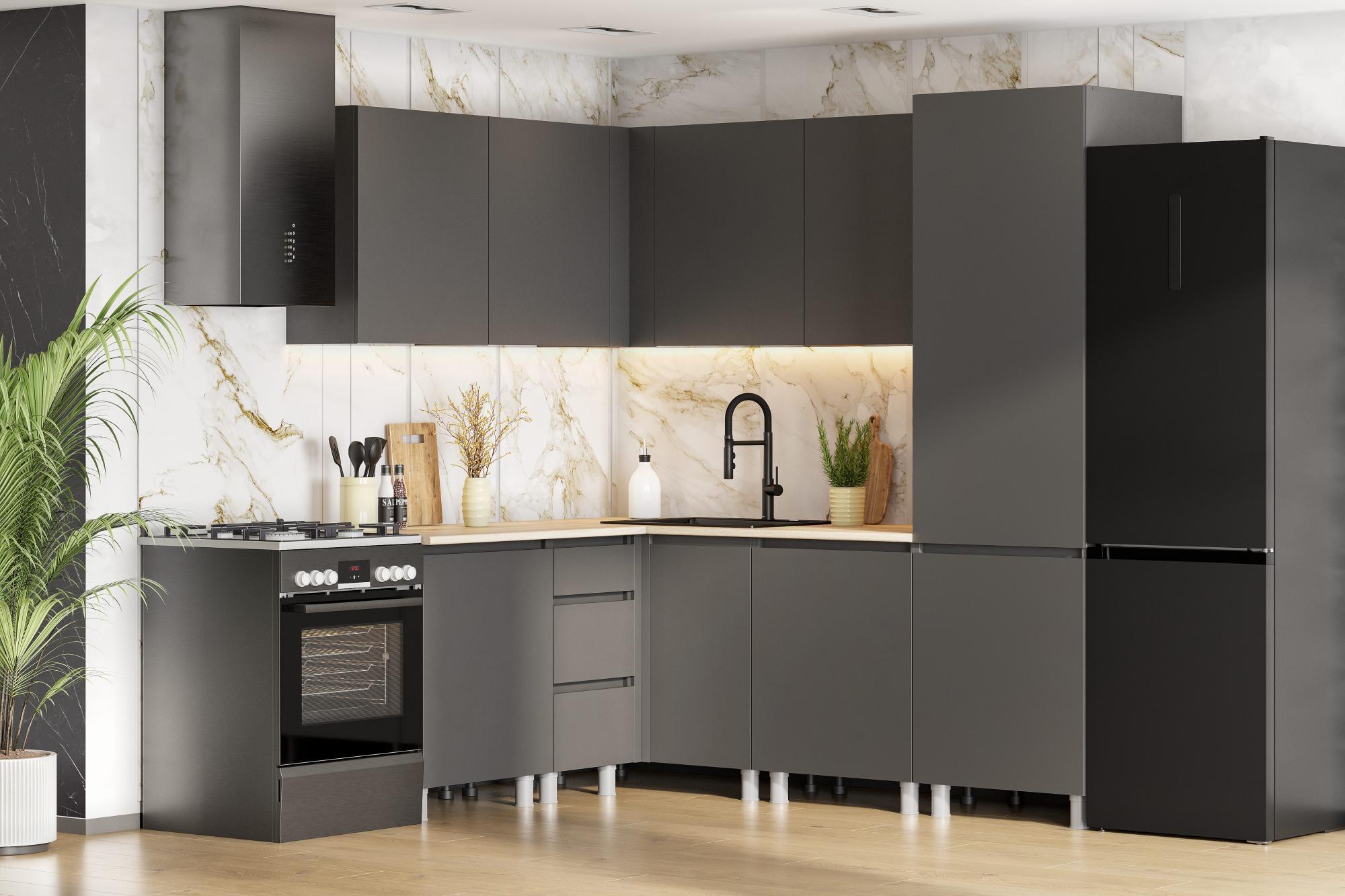 Цвет графит серый придает кухонному гарнитуру современный и строгий внешний вид. Матовый темный оттенок выглядит стильно и легко сочетается со светлыми стенами, деревом и металлическими элементами в интерьере. Такая модульная кухня особенно актуальна для современных и минималистичных интерьеров.