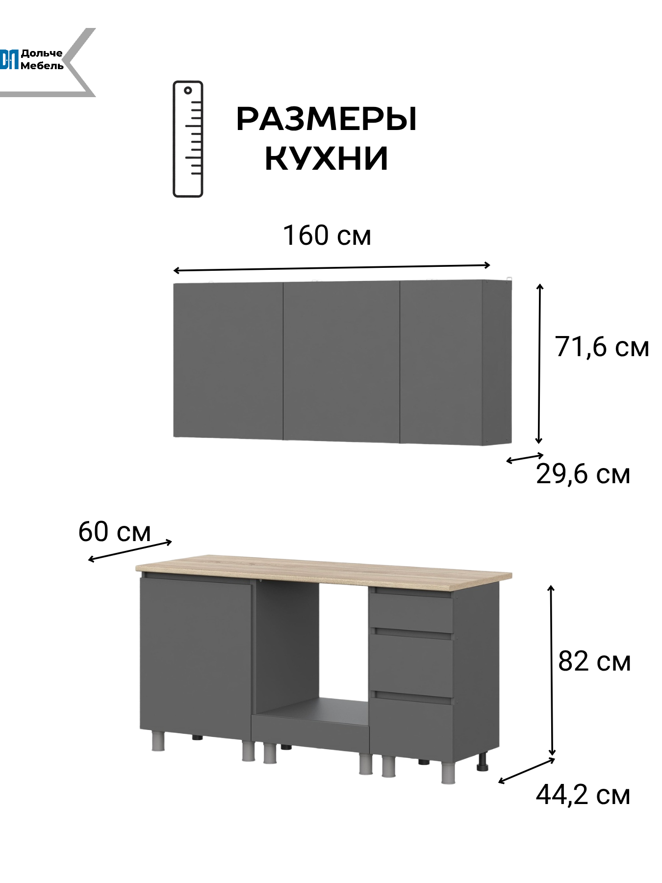 Ширина кухонного гарнитура 160 см делает его оптимальным решением для небольших кухонь. Компактные размеры позволяют эффективно использовать пространство, сохраняя достаточную вместительность для ежедневного использования.