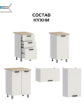 Модульная конструкция гарнитура обеспечивает удобное хранение посуды, кухонных принадлежностей и продуктов. Верхние и нижние шкафы расположены так, чтобы рабочая зона была максимально эргономичной. Кухонный гарнитур подходит для ежедневного использования и оптимален для небольших семей или одного-двух человек.