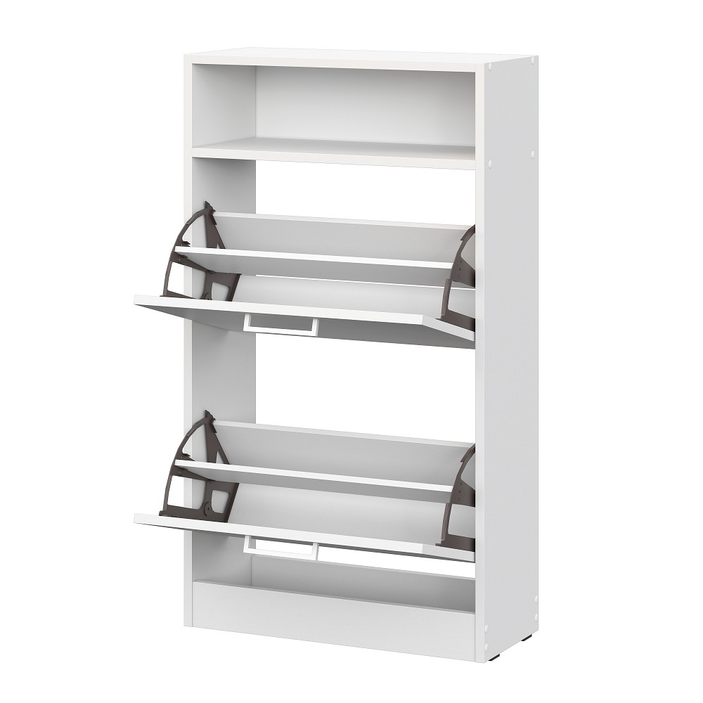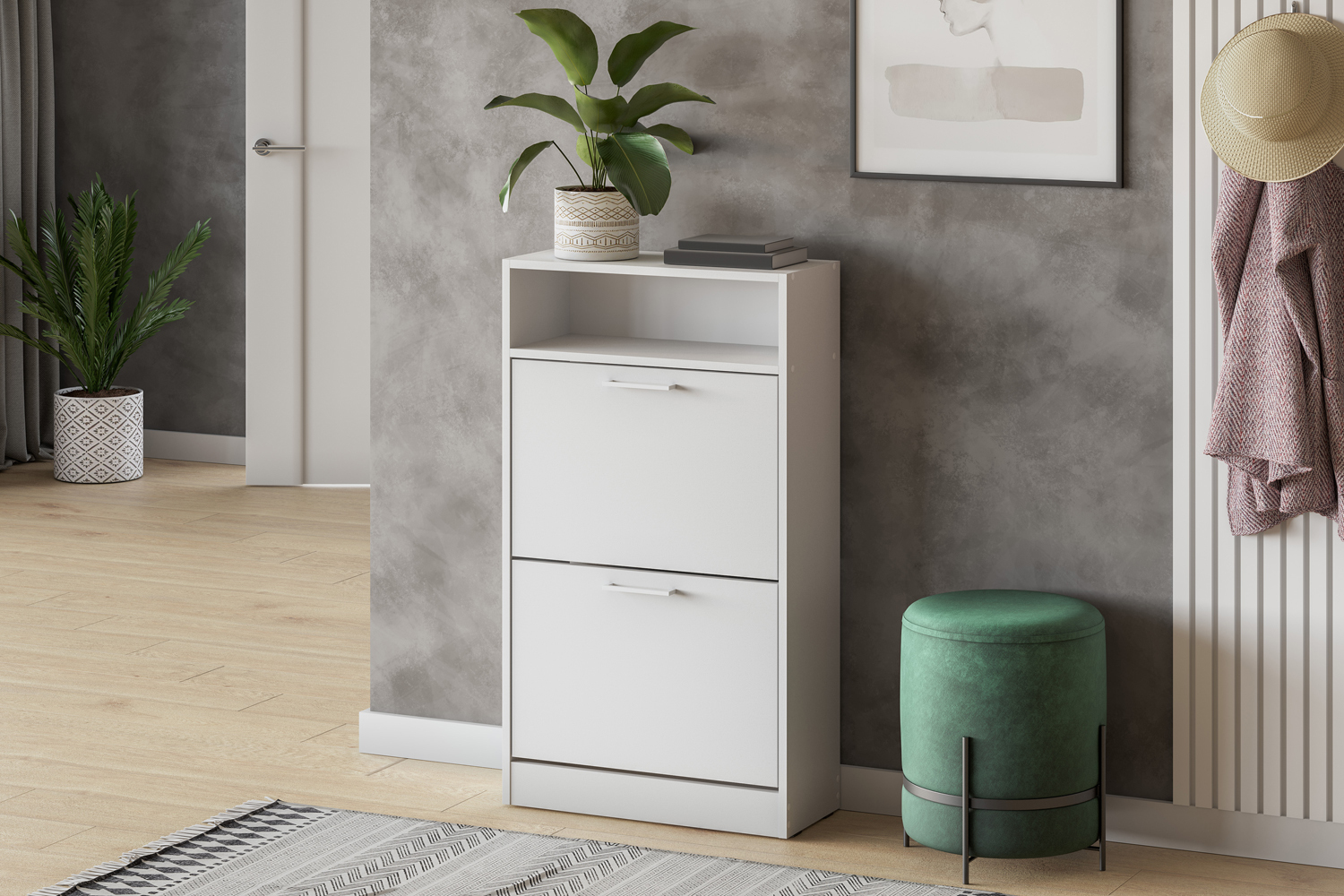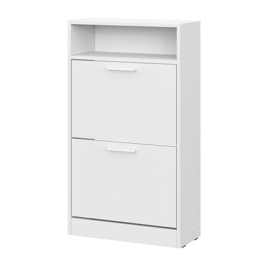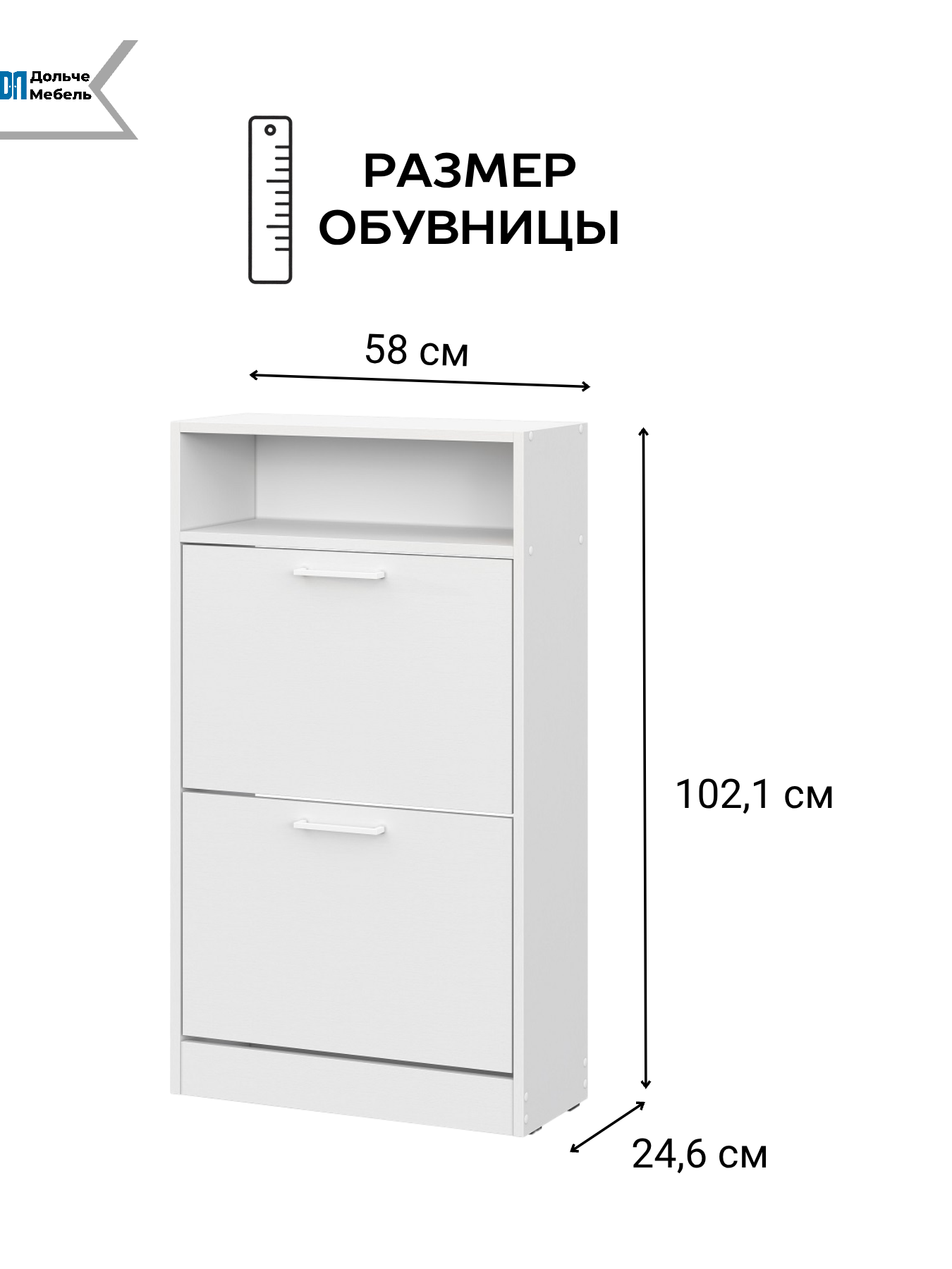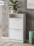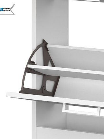 Узкая обувница глубиной всего 24,6 см занимает минимум места и идеально подходит для небольших прихожих и коридоров. Закрытая конструкция защищает обувь от пыли и сохраняет аккуратный внешний вид интерьера. Верхняя открытая полка позволяет разместить ключи, аксессуары или предметы декора.