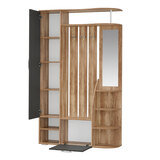 В состав прихожей "Агата" входят: секция с вешалками для верхней одежды, полка для головных уборов с вертикальной металлической штангой, пенальный шкаф с полками, открытые полки и закрытый отдел для обуви и вещей, а также зеркало.