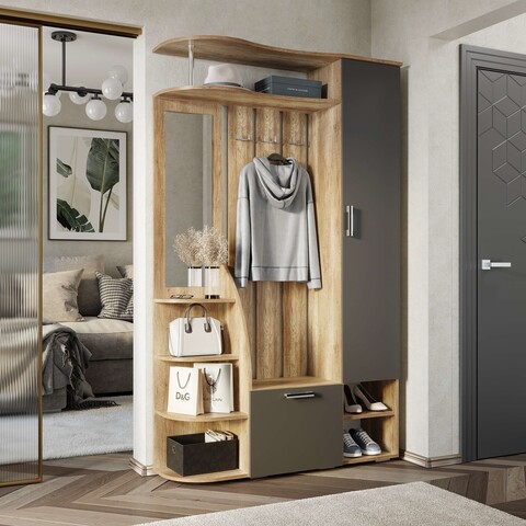 Габариты прихожей составляют 120х35х202 см, что позволяет ей гармонично вписаться в любое пространство. Несмотря на компактные размеры, в прихожей есть все необходимые элементы: полка для шляп, вешалка, шкаф, тумба, стеллаж, обувница и зеркало.