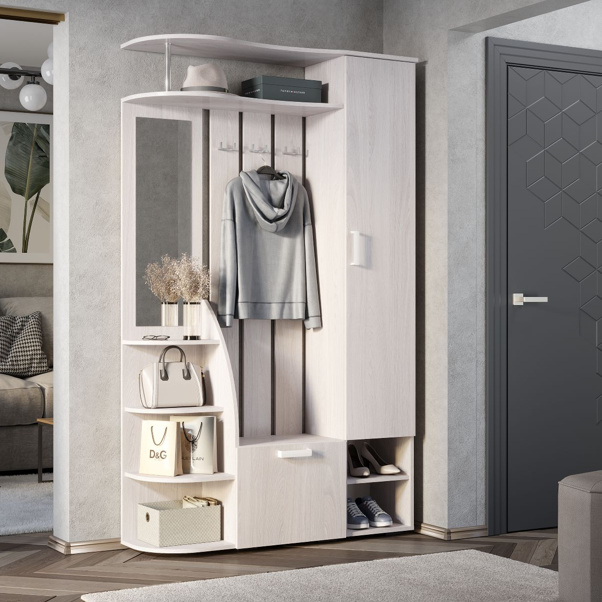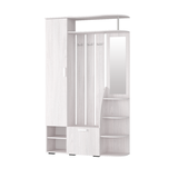 Габариты прихожей составляют 120х35х202 см, что позволяет ей гармонично вписаться в любое пространство. Несмотря на компактные размеры, в прихожей есть все необходимые элементы: полка для шляп, вешалка, шкаф, тумба, стеллаж, обувница и зеркало.
