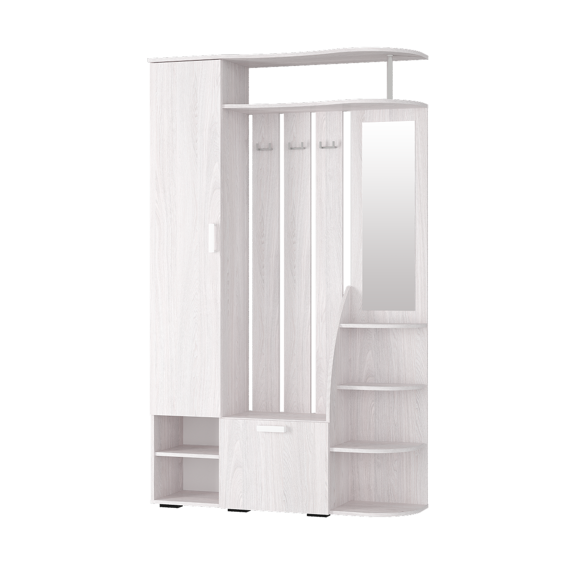 В состав прихожей "Анора" входят: секция с вешалками для верхней одежды, полка для головных уборов с вертикальной металлической штангой, пенальный шкаф с полками, открытые полки и закрытый отдел для обуви и вещей, а также зеркало.