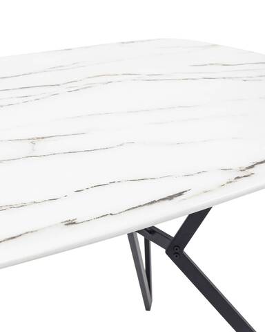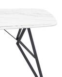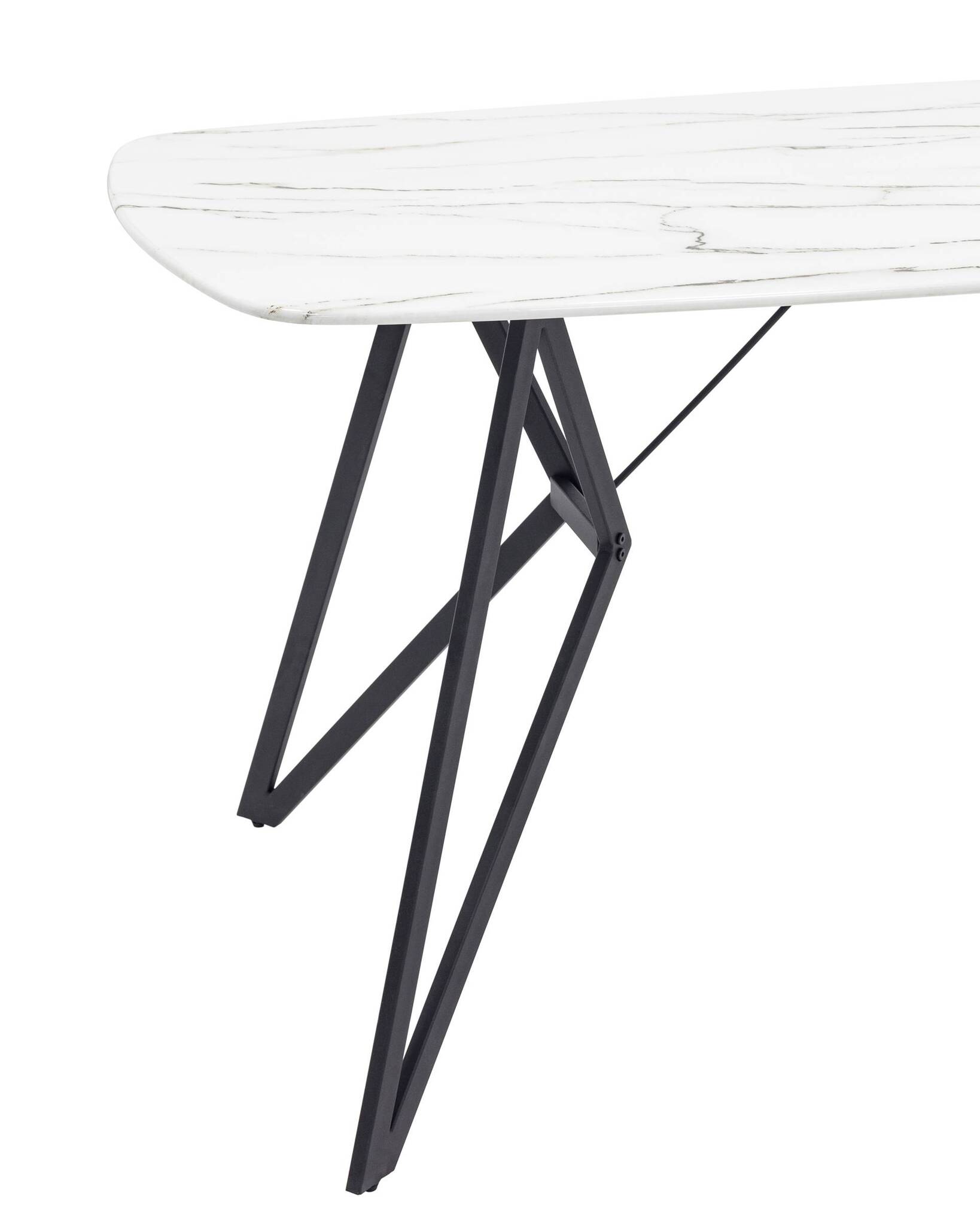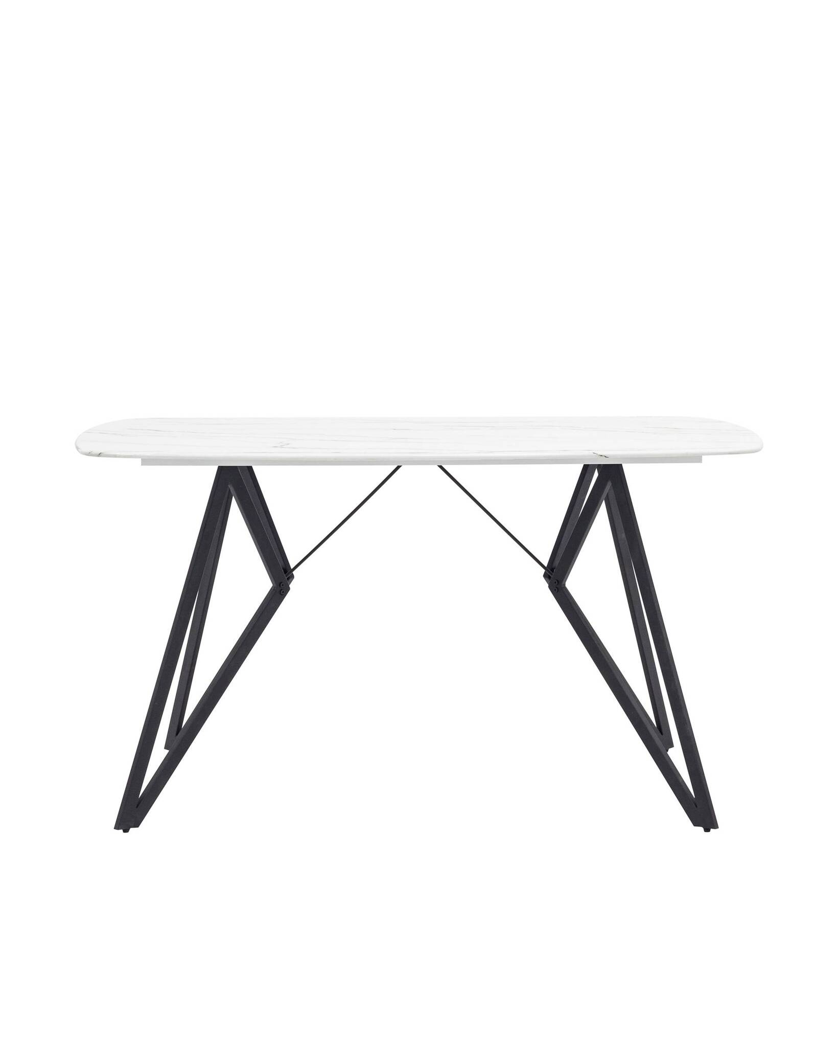 Белая столешница контрастирует с черным геометричным металлическим основанием. Ножки покрыты порошковой краской. В основании – специальные подпятники. Они помогут избежать царапин и отрегулировать стол по высоте, если на полу имеются неровности.