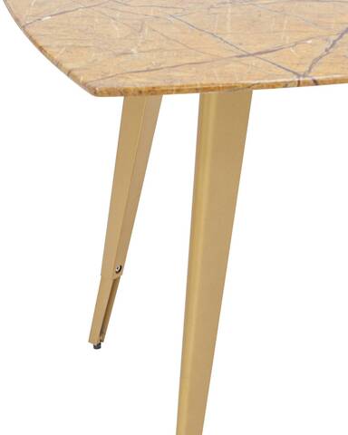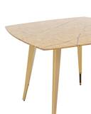 Обеденный стол с красивой стеклянной столешницей насыщенного цвета охры с рисунком под мрамор.