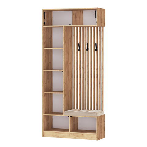 Благодаря стильному дизайну и компактным размерам вешалка Руэлла впишется в малогабаритную прихожую или квартиру-студию. Наличие полок, надежные крючки и ниша под обувь позволят разместить верхнюю одежду, уличную и домашнюю обувь, сезонные аксессуары и головные уборы, а наличие мягкого сидения добавит комфорта от ежедневных сборов перед выходом на улицу. Особенности - Материал корпуса: ЛДСП - Материал фасада: ЛДСП - Отсутствие лицевой фурнитуры - Комплектуется накладными петлями (прямыми) - Механизм открывания Push-to-Open - Мягкое сиденье для центральной секции входит в комплект