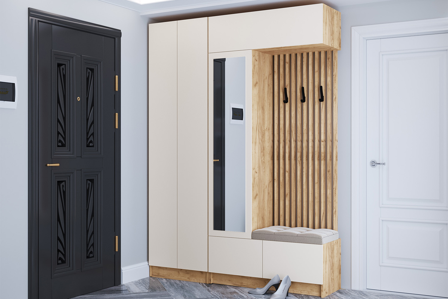 ✔ Полный комплект – включает все необходимое: шкаф для верхней одежды, прихожую с сидением для комфортного переобувания, полки для обуви и зеркало (опционально).