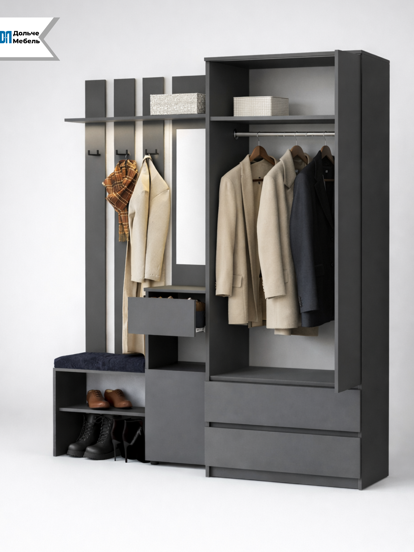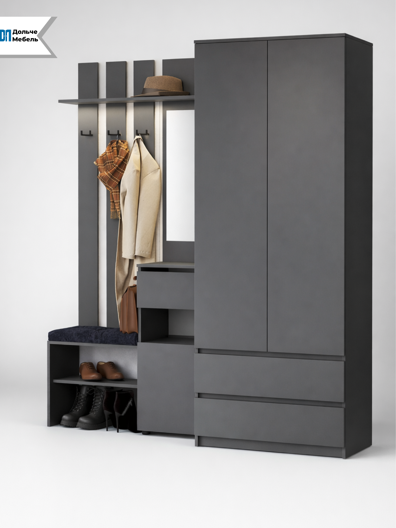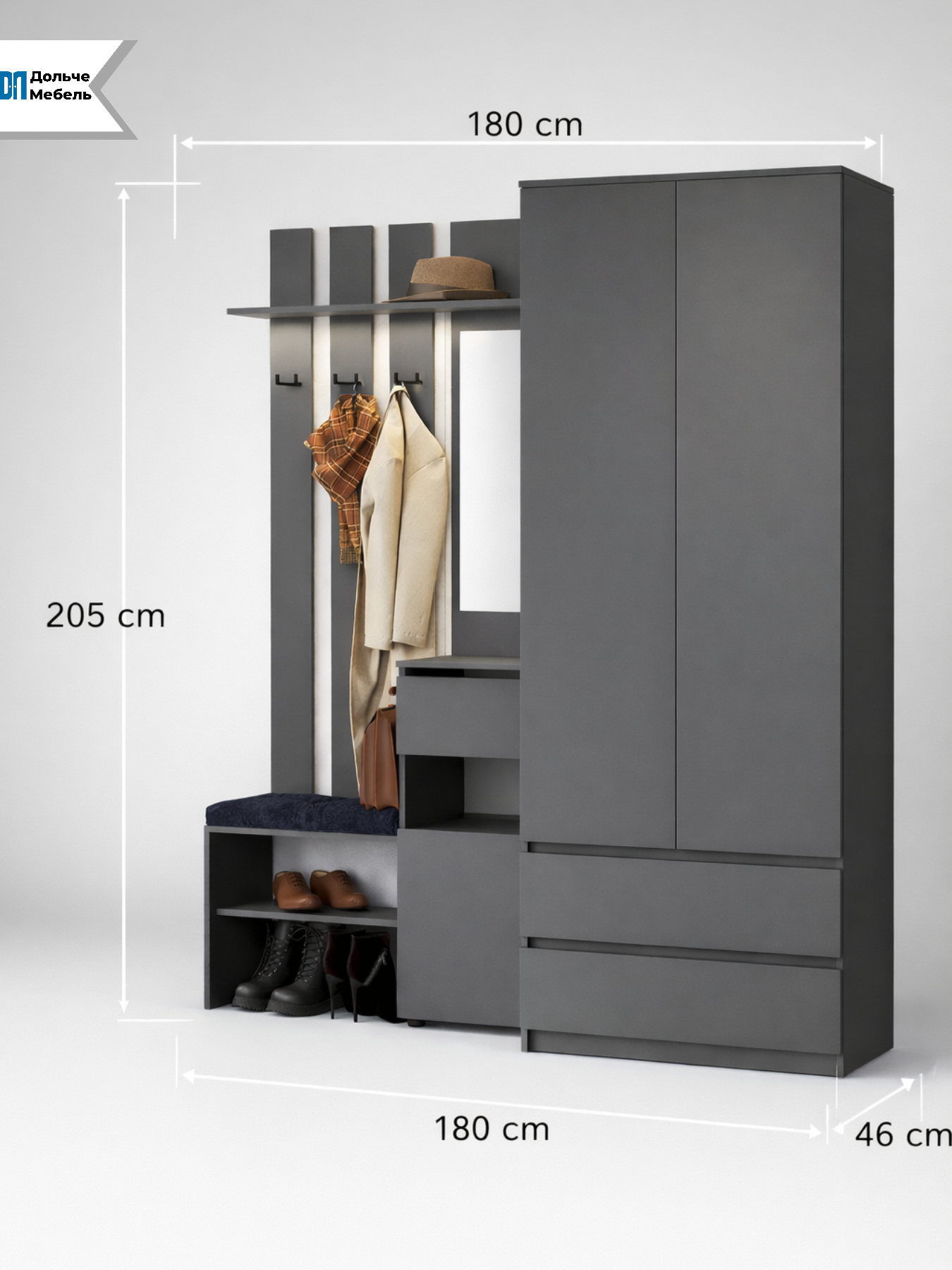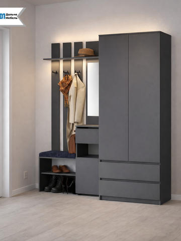 Благодаря компактной глубине 46 см прихожая не загромождает пространство, при этом вмещает всё необходимое для повседневного хранения. Современный цвет графит выглядит дорого, универсально сочетается с любым интерьером и не маркий в эксплуатации.
