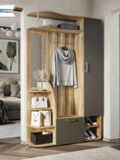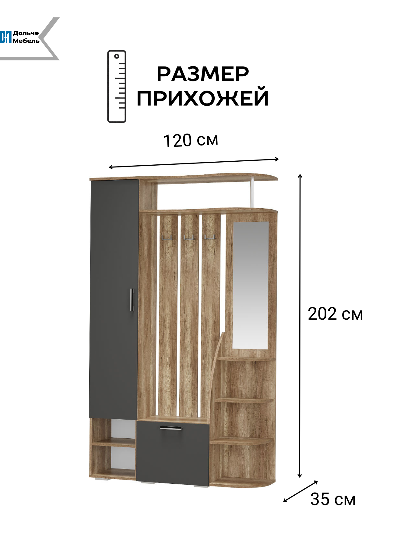 Габариты прихожей составляют 120х35х202 см, что позволяет ей гармонично вписаться в любое пространство. Несмотря на компактные размеры, в прихожей есть все необходимые элементы: полка для шляп, вешалка, шкаф, тумба, стеллаж, обувница и зеркало.