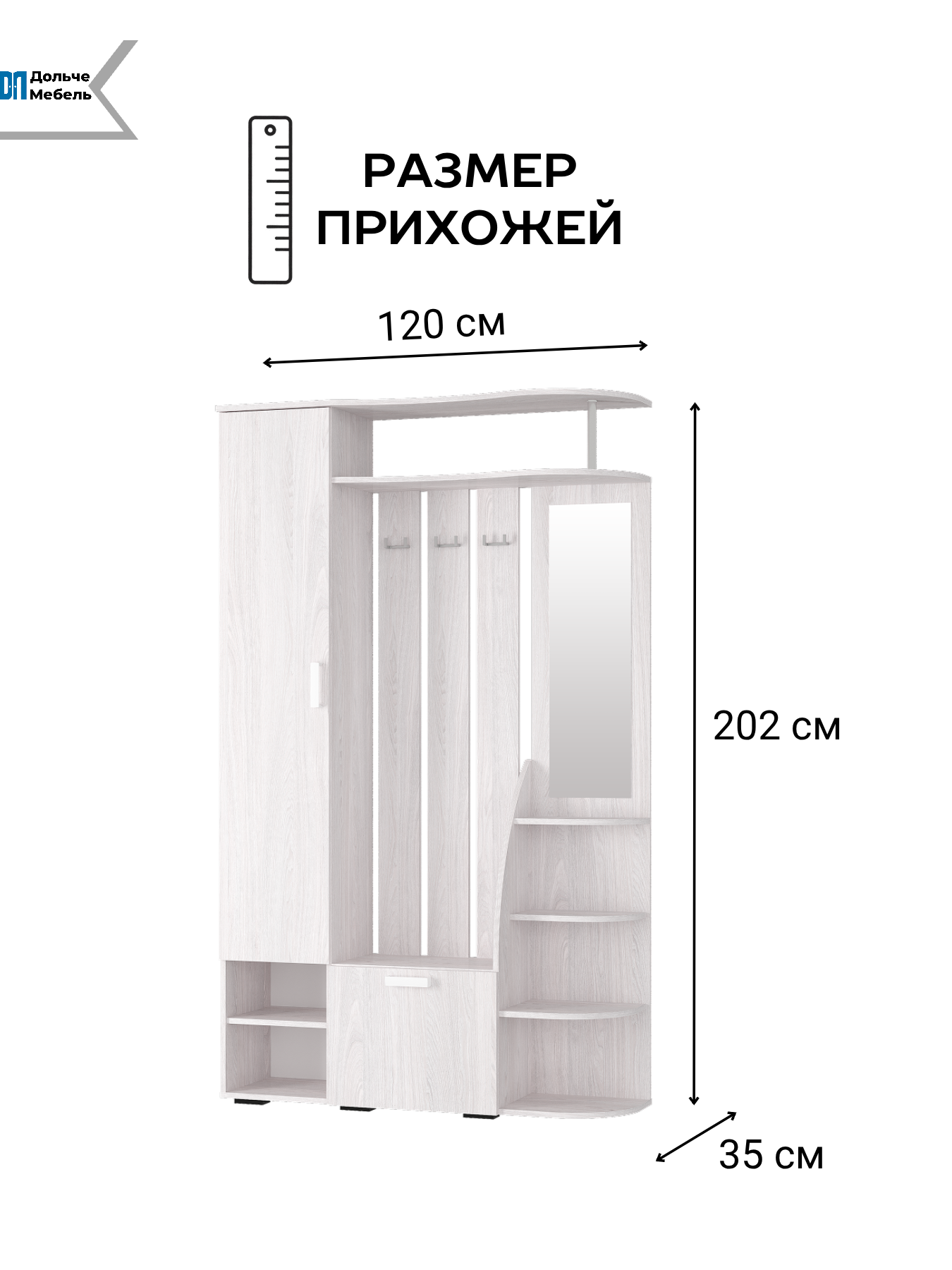 Габариты прихожей составляют 120х35х202 см, что позволяет ей гармонично вписаться в любое пространство. Несмотря на компактные размеры, в прихожей есть все необходимые элементы: полка для шляп, вешалка, шкаф, тумба, стеллаж, обувница и зеркало.