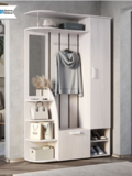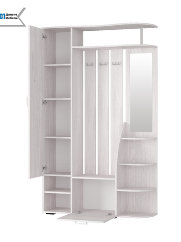 В состав прихожей "Анора" входят: секция с вешалками для верхней одежды, полка для головных уборов с вертикальной металлической штангой, пенальный шкаф с полками, открытые полки и закрытый отдел для обуви и вещей, а также зеркало.