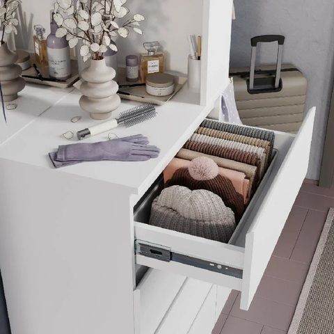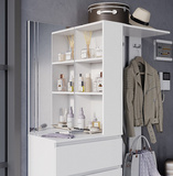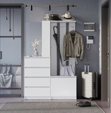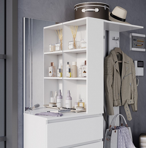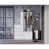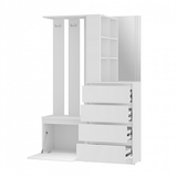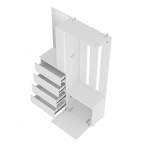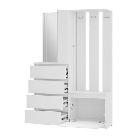 Особенностью данной модели является наличие 4-х выдвижных ящиков с шариковыми направляющими, тумбы с откидной створкой, зеркала, открытых полок, надежных крючков для верхней одежды и верхней полки под сезонные аксессуары. Это позволяет максимально эффективно использовать пространство прихожей и удобно хранить все необходимые вещи.