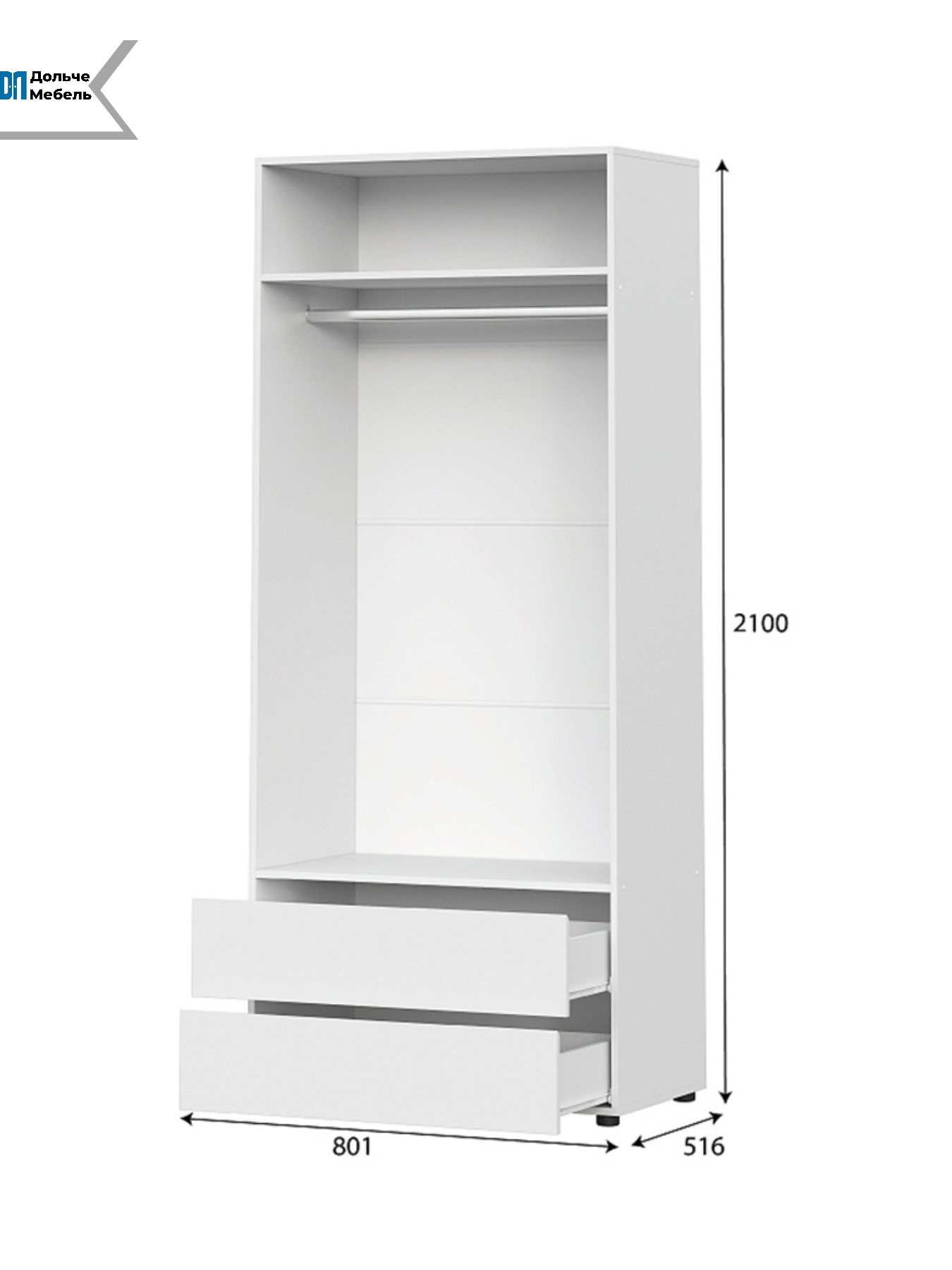 Шкаф с распашными дверями позволяет удобно хранить верхнюю одежду и сезонные вещи, а выдвижные ящики подходят для мелочей, перчаток и аксессуаров. Большое зеркало визуально расширяет пространство и избавляет от необходимости отдельного настенного зеркала.