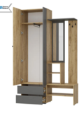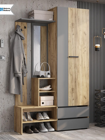 Этот стеллаж со шкафом в прихожую комнату станет отличным элементом для вашего интерьера. Мебель для дома обеспечивает удобное хранение перчаток, шапок, зонтов, сумок и других аксессуаров. Комплект включает шкаф для верхней одежды и настенную тумбу с зеркалом. Закрытые дверцами модули гарантируют порядок в коридоре.