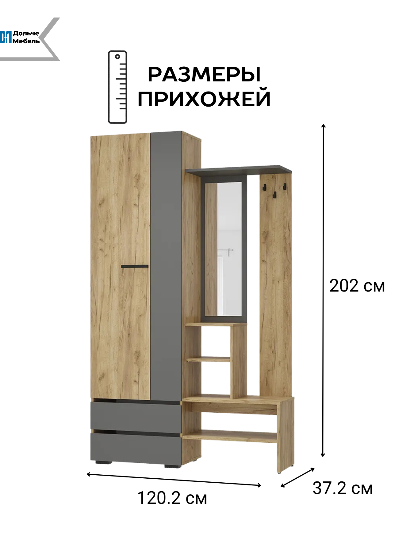 Прихожая «Твист» — это готовое решение для тех, кто ценит эстетику минимализма и надежность. Текстура натурального дуба «крафт» в сочетании с матовыми графитовыми вставками создает брутальный и одновременно уютный образ. Благодаря продуманным габаритам (ширина 120,2 см), модель идеально подходит для стандартных квартир, обеспечивая удобное хранение одежды, обуви и аксессуаров.