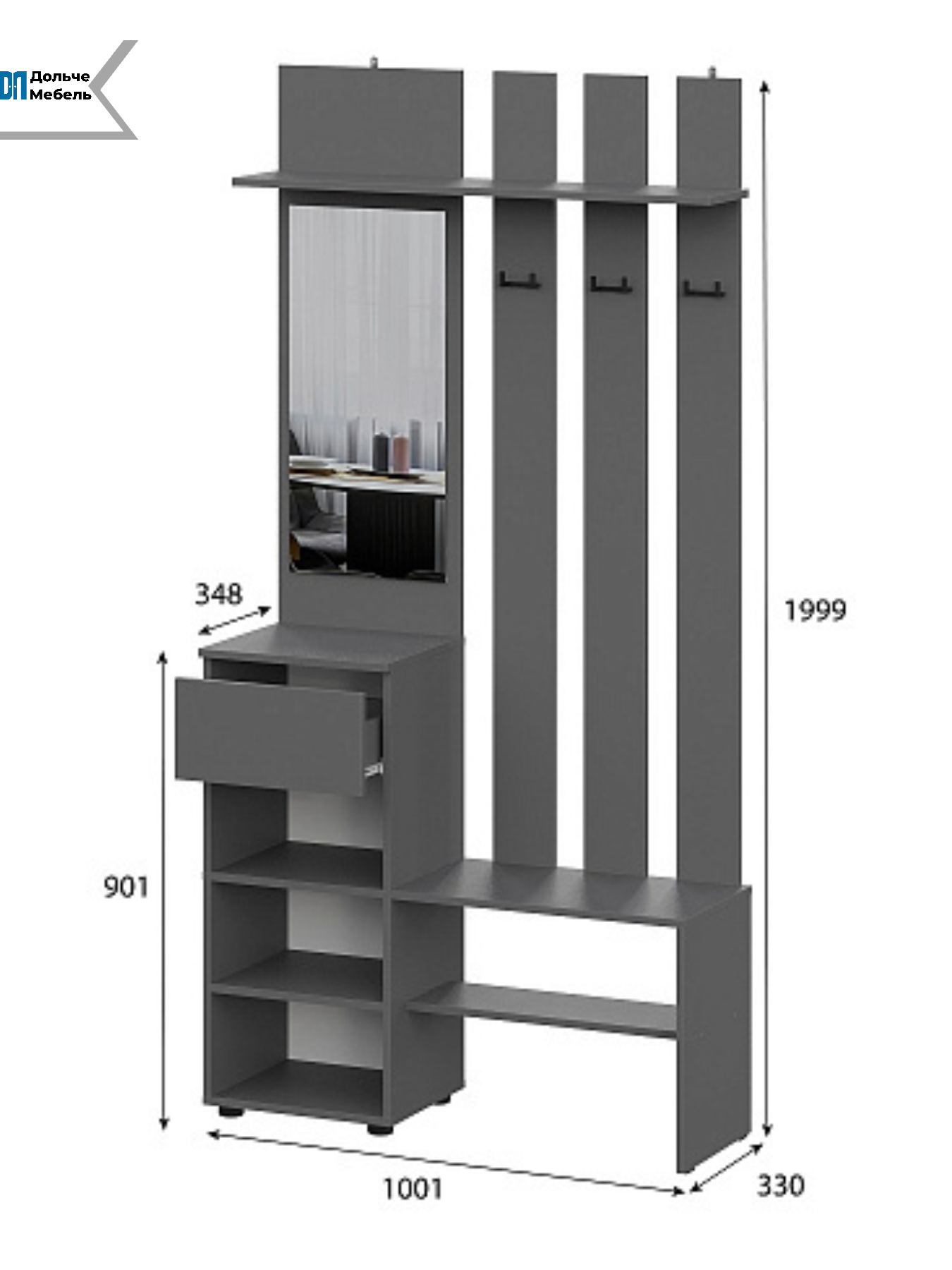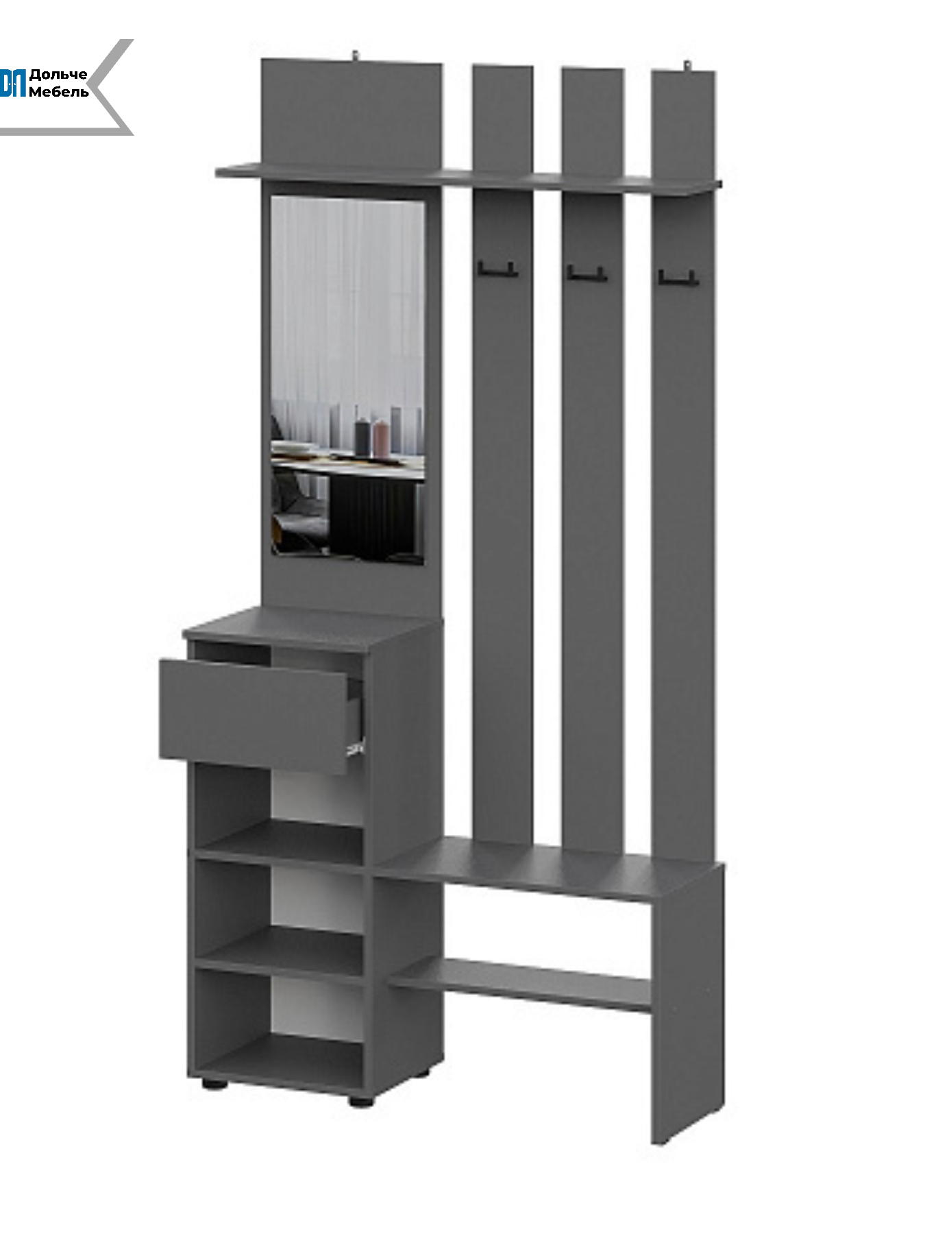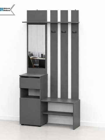 В комплекте предусмотрены вешалка с крючками для верхней одежды, зеркало, удобная тумба для обуви и открытая полка для повседневных вещей. Всё необходимое для комфортного использования — в одном компактном модуле.