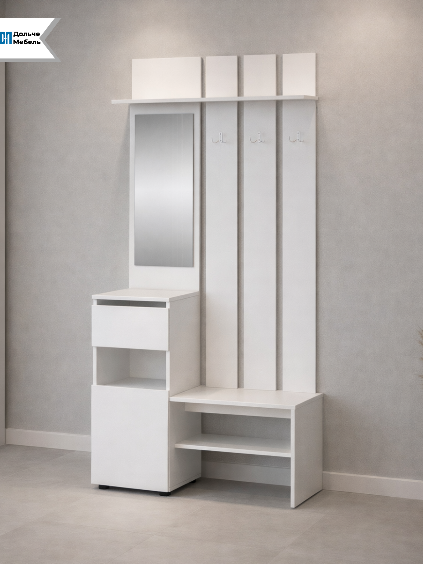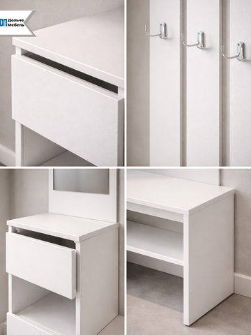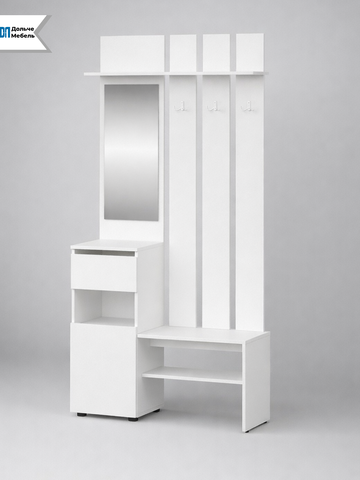 Комплект включает вешалку с крючками для верхней одежды, зеркало, удобную тумбу для обуви и открытую полку для повседневных вещей. Белый цвет визуально расширяет пространство, делает интерьер светлее и аккуратнее.
