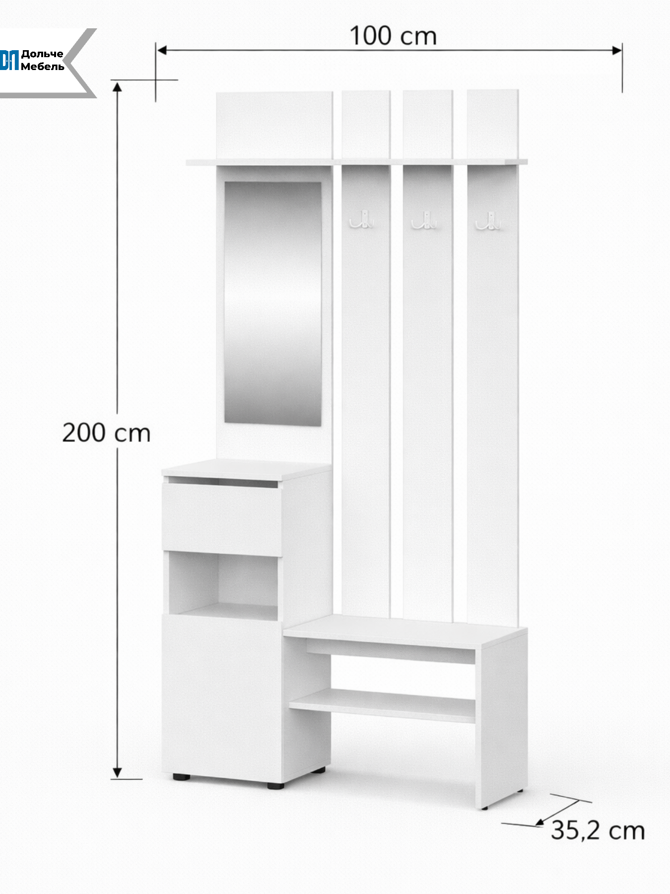 Прихожая Арника Токио — компактное и функциональное решение для узкого коридора и небольших прихожих. Благодаря ширине всего 100 см и глубине 35 см модель идеально подходит для малогабаритных квартир, не перегружая пространство.