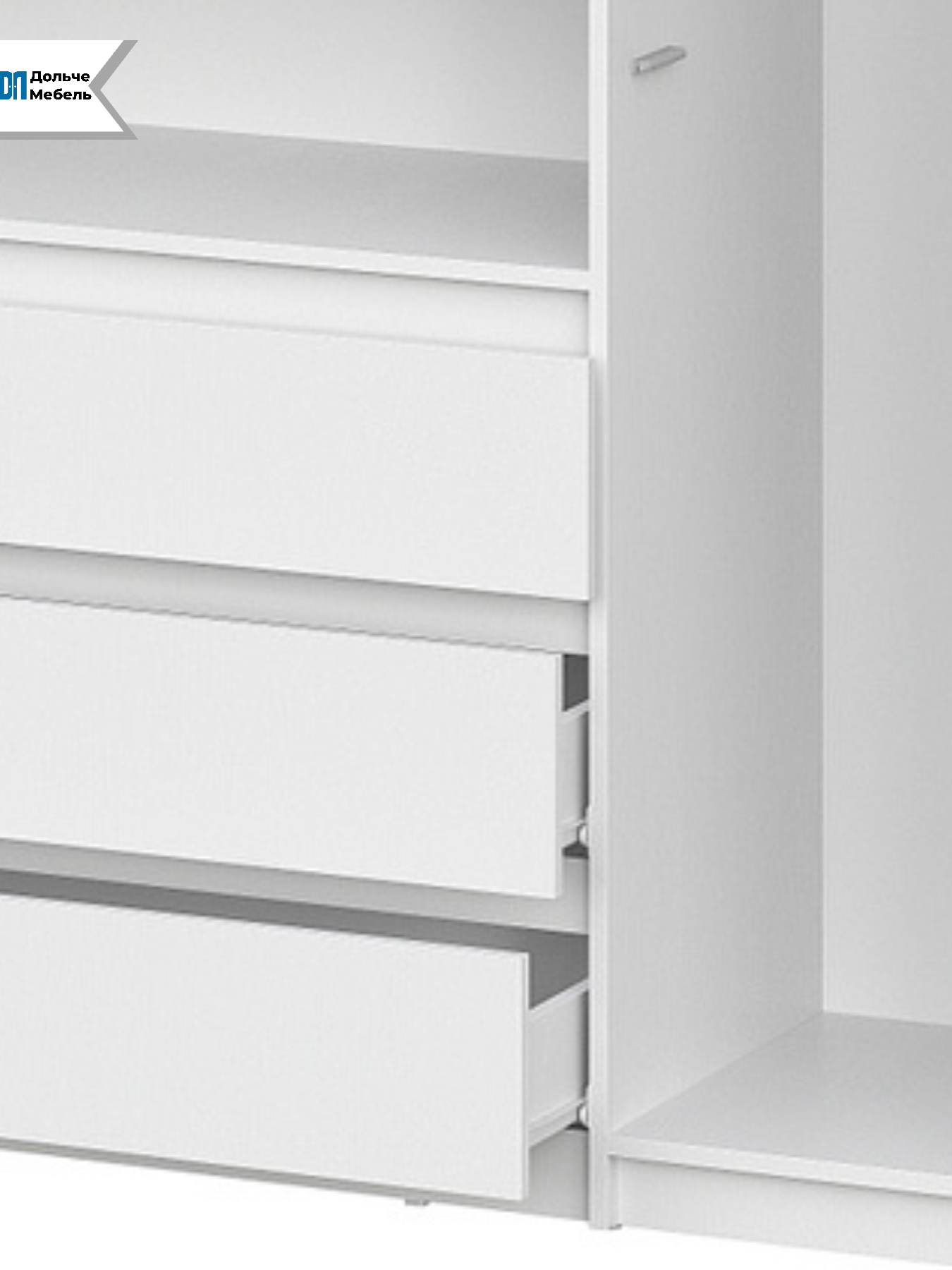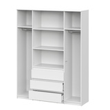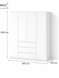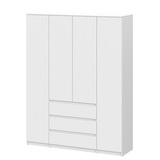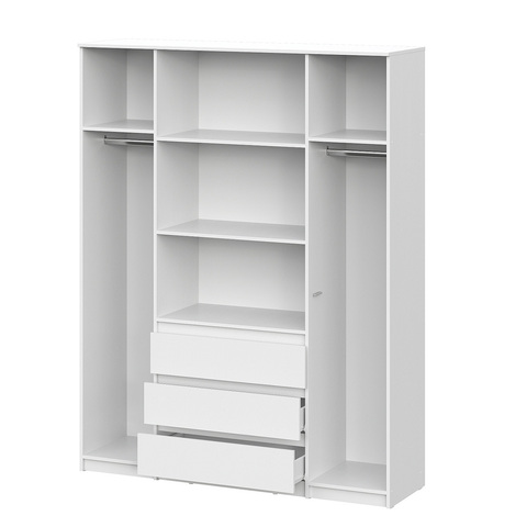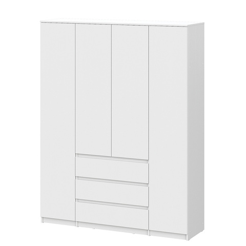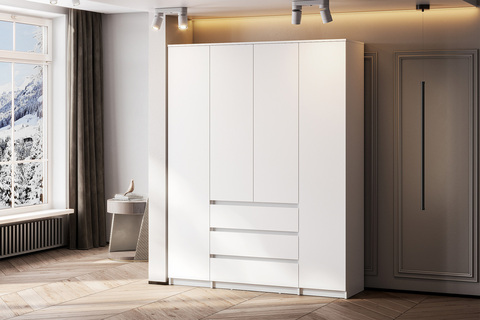 Шкаф имеет четыре дверцы, что позволяет удобно распределить вещи по зонам. Внутреннее наполнение включает отделения для одежды на вешалках, полки и выдвижные ящики, обеспечивая порядок для повседневного и сезонного хранения.